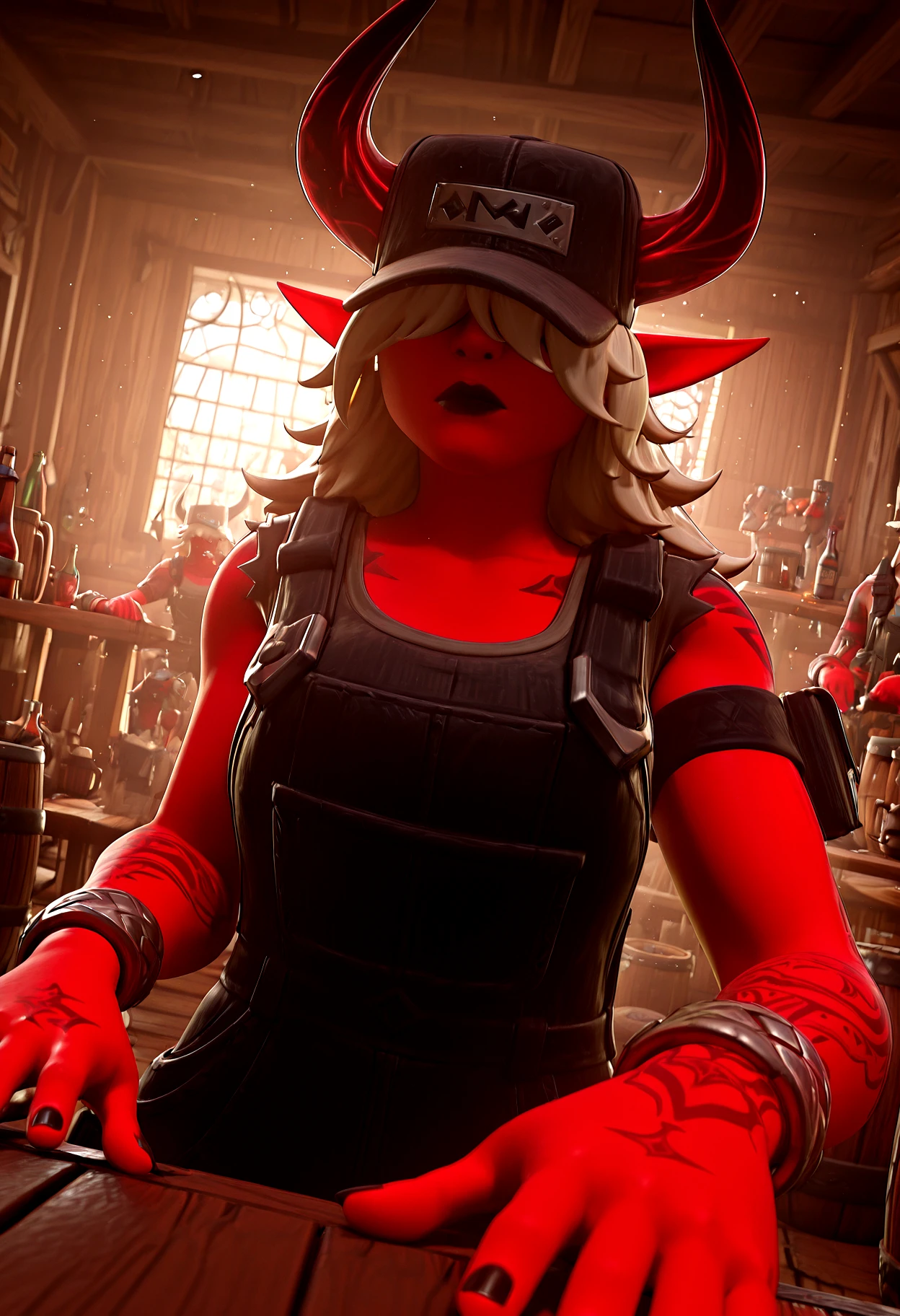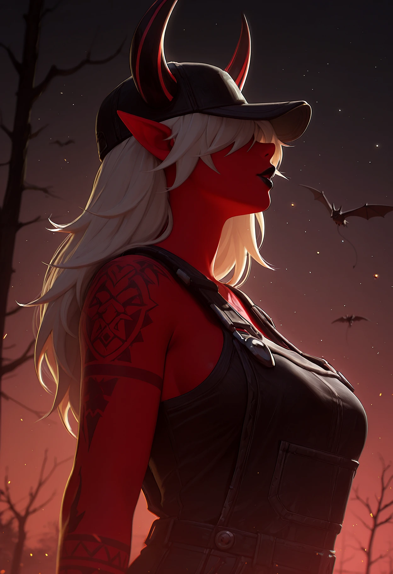 1girl, demon girl, black lipstick, plump lips, thick lips, fat lips, big lips, colored skin, red skin, pointy ears, hair over eyes, hair covering eyes, long hair, white hair, horns, arm tattoo, large breasts, wide hips, (thick thighs:1.15), demon tail,'Fits