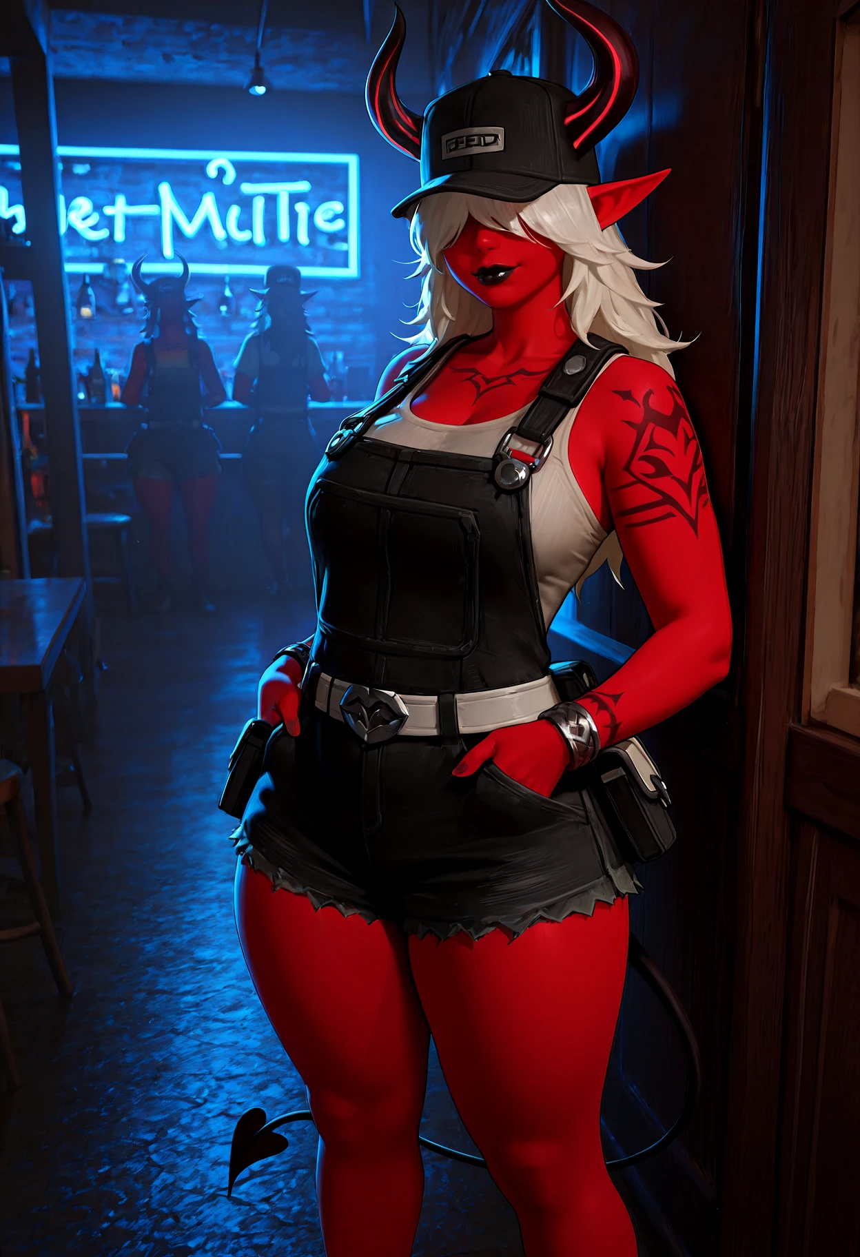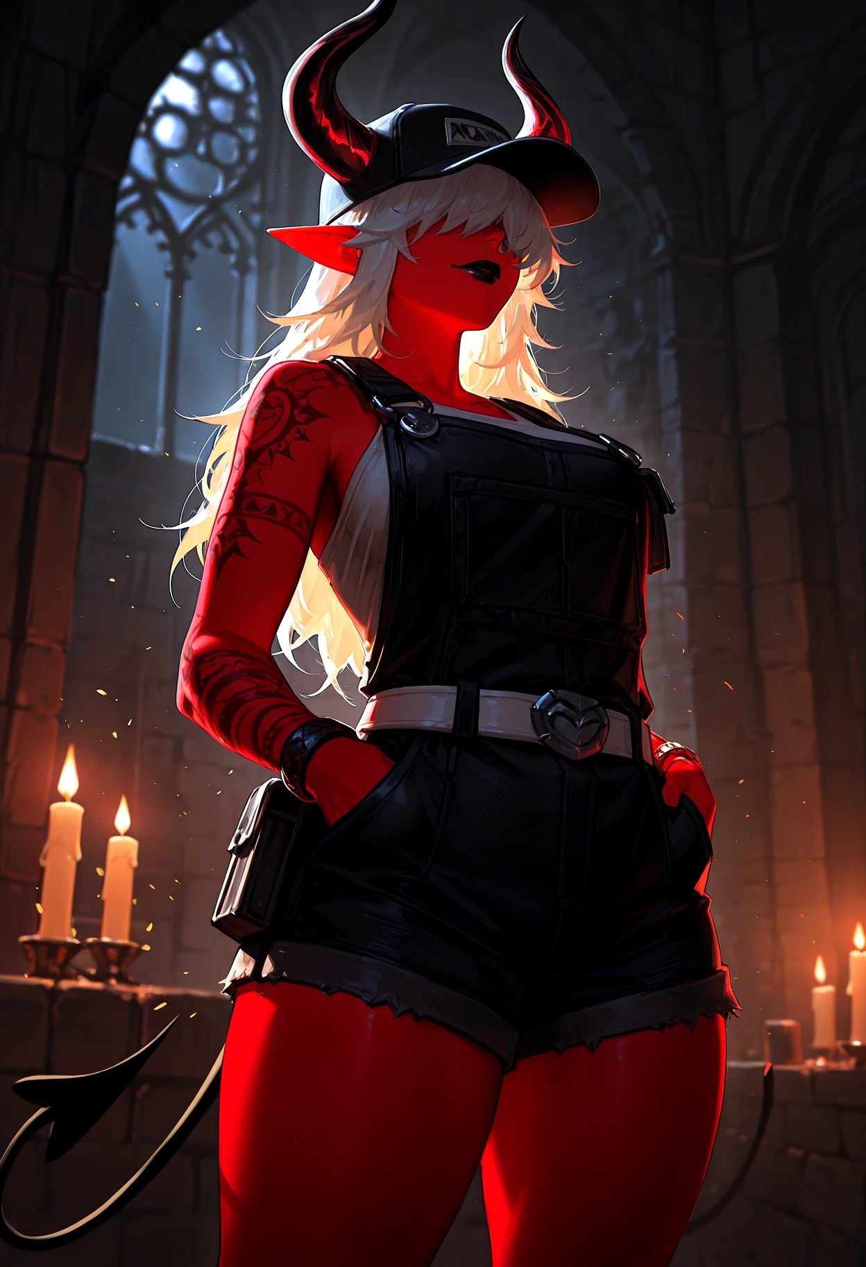 baseball cap, horns through headwear, overalls, shorts, white belt, belt pouch, bracelet,Description