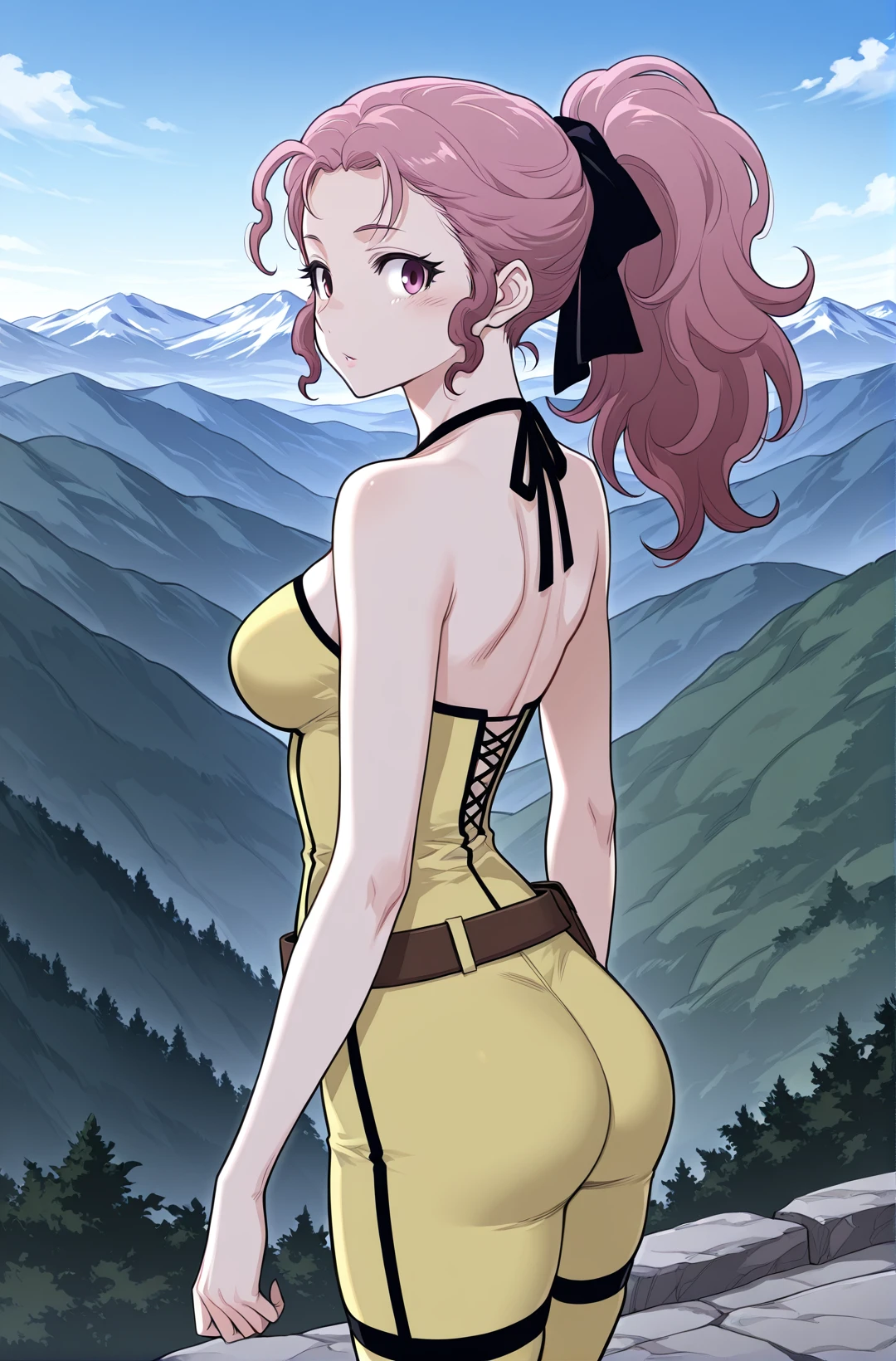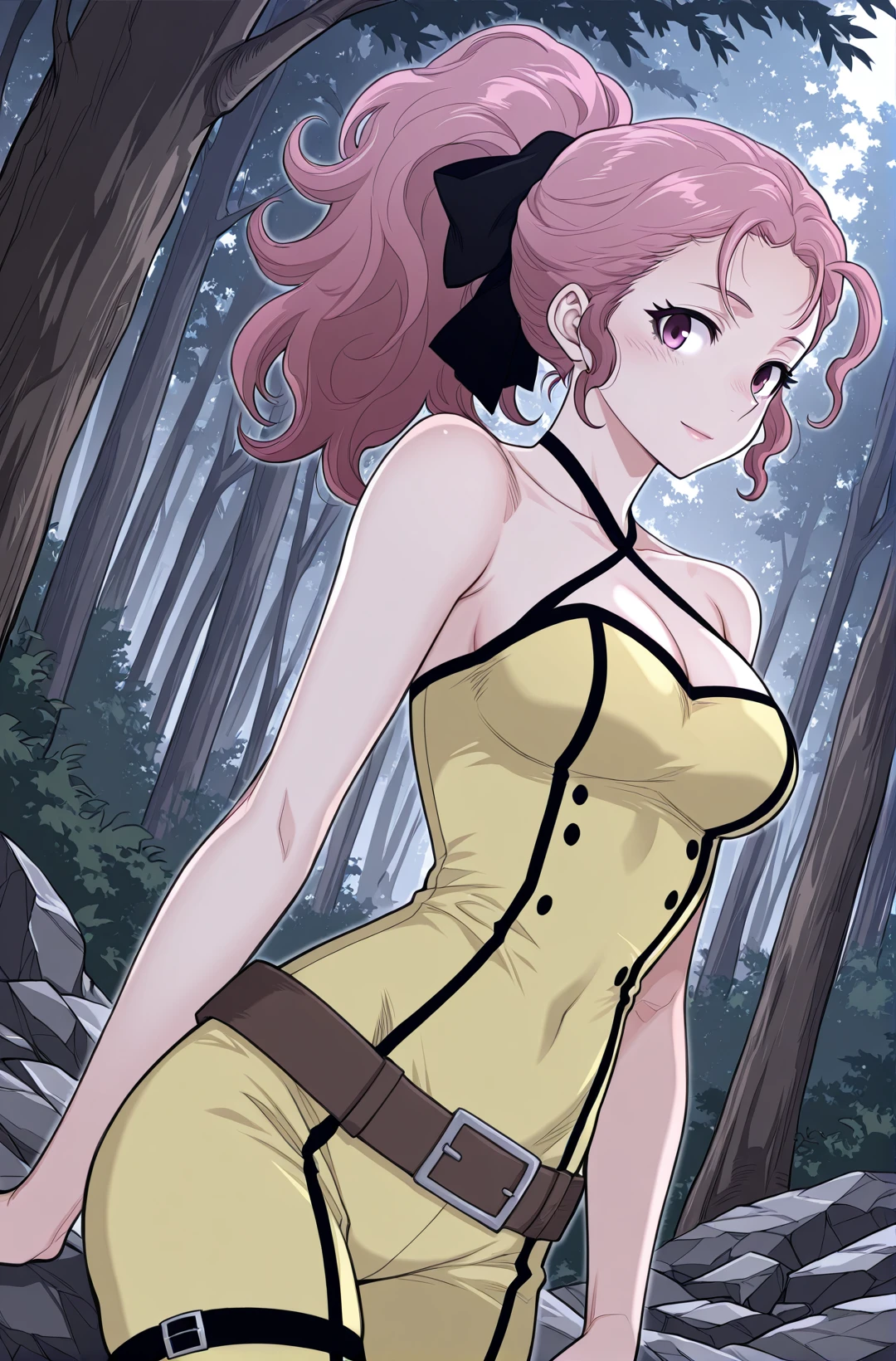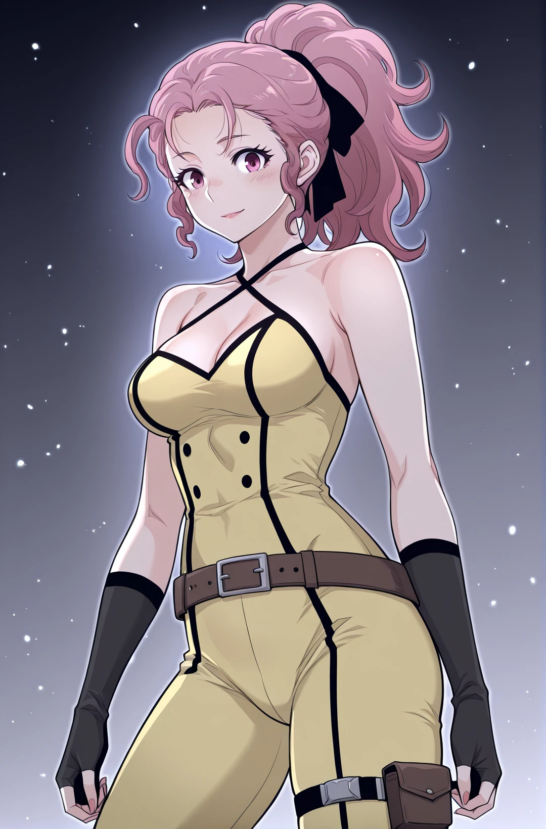 Heera, 1 girl, solo, pink eyes, medium-length curly hair, pink hair, tied back ponytail, parted bangs, loose strands, short wavy sidelocks, black hair bow,