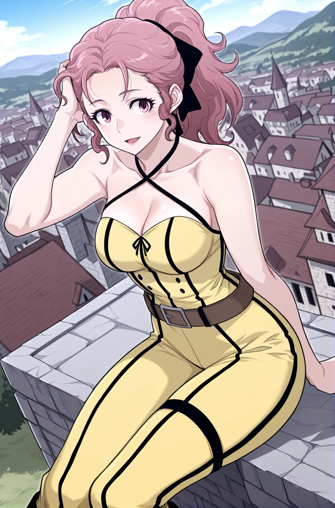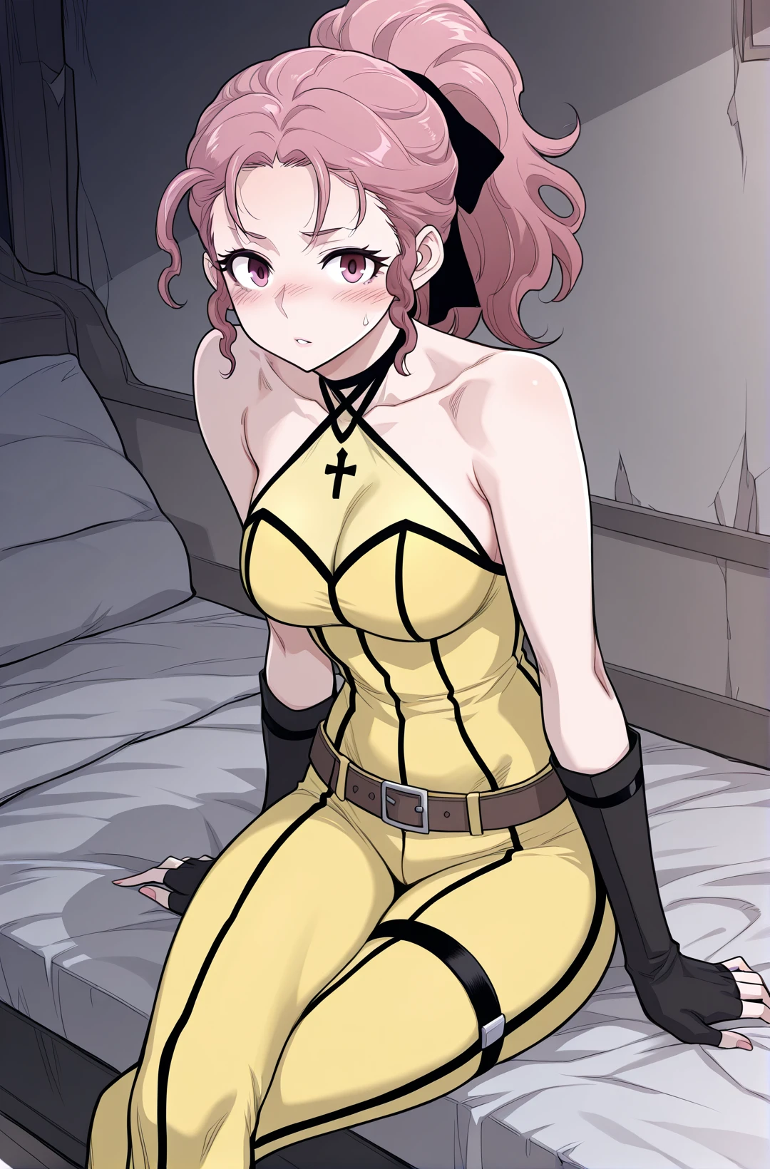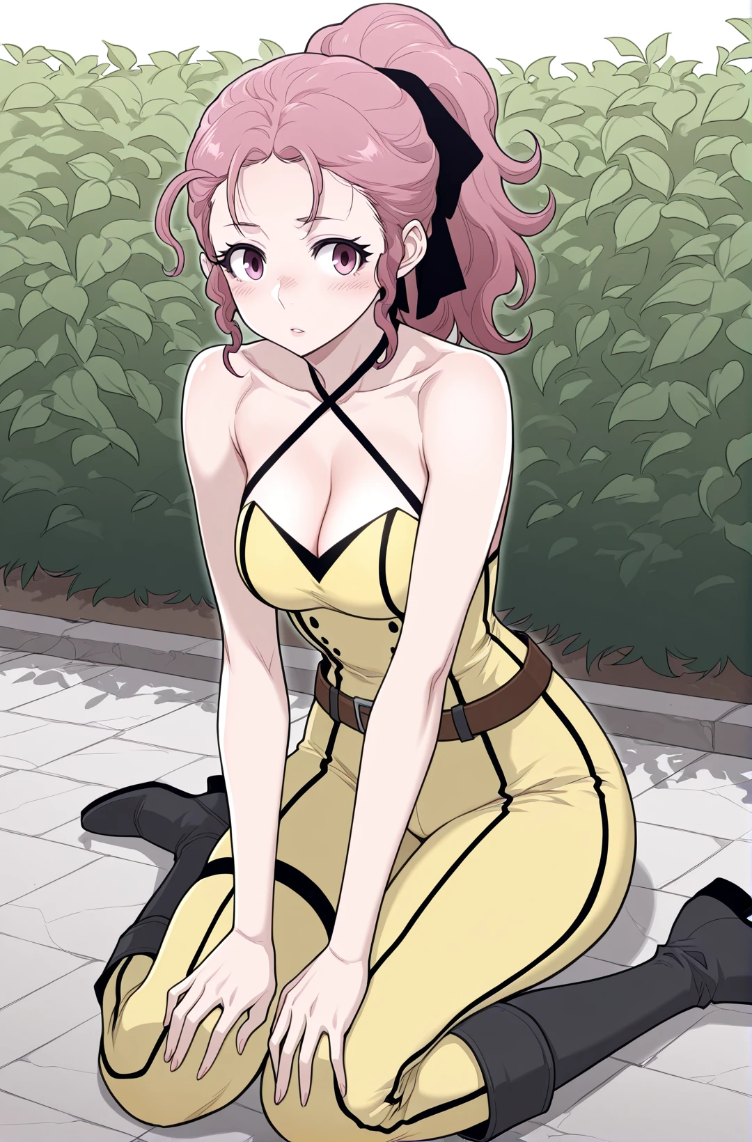 Heera_outfit, yellow jumpsuit, sleeveless, halter neck, bare shoulders, black crisscross straps, black trim details, black vertical side stripes, thigh straps, brown belt, black knee-high boots,