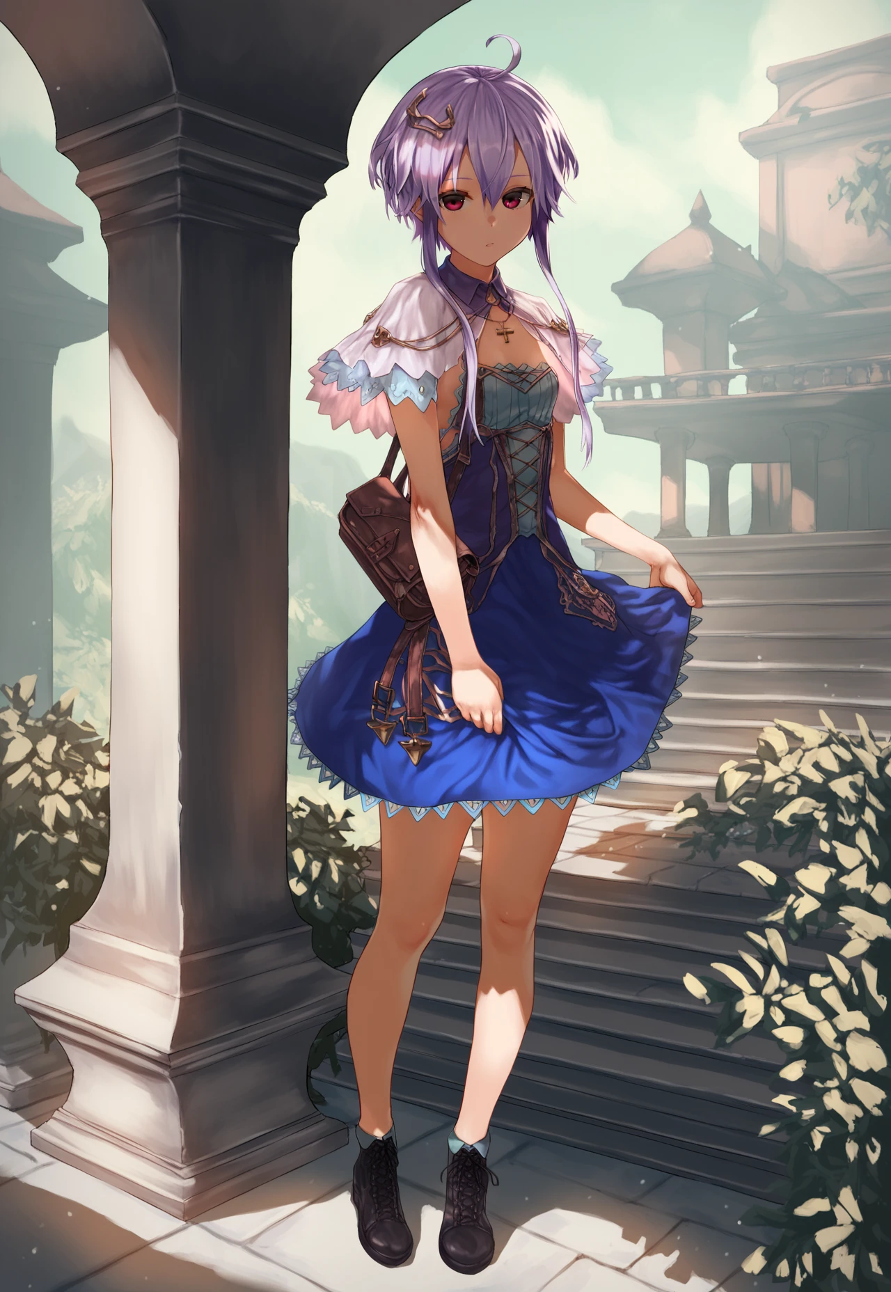 brown eyes, short hair, purple hair, looking at viewer, hair ornament, capelet,skirt, dress, cross-laced footwear, blue skirt, bangs, sidelocks, light purple hair, jewelry, lace, lace trim, frills, necklace, blue dress,ahoge, breasts, small breasts, short sleeves, short hair with long locks, lace-trimmed skirt, hair between eyes, shirt,