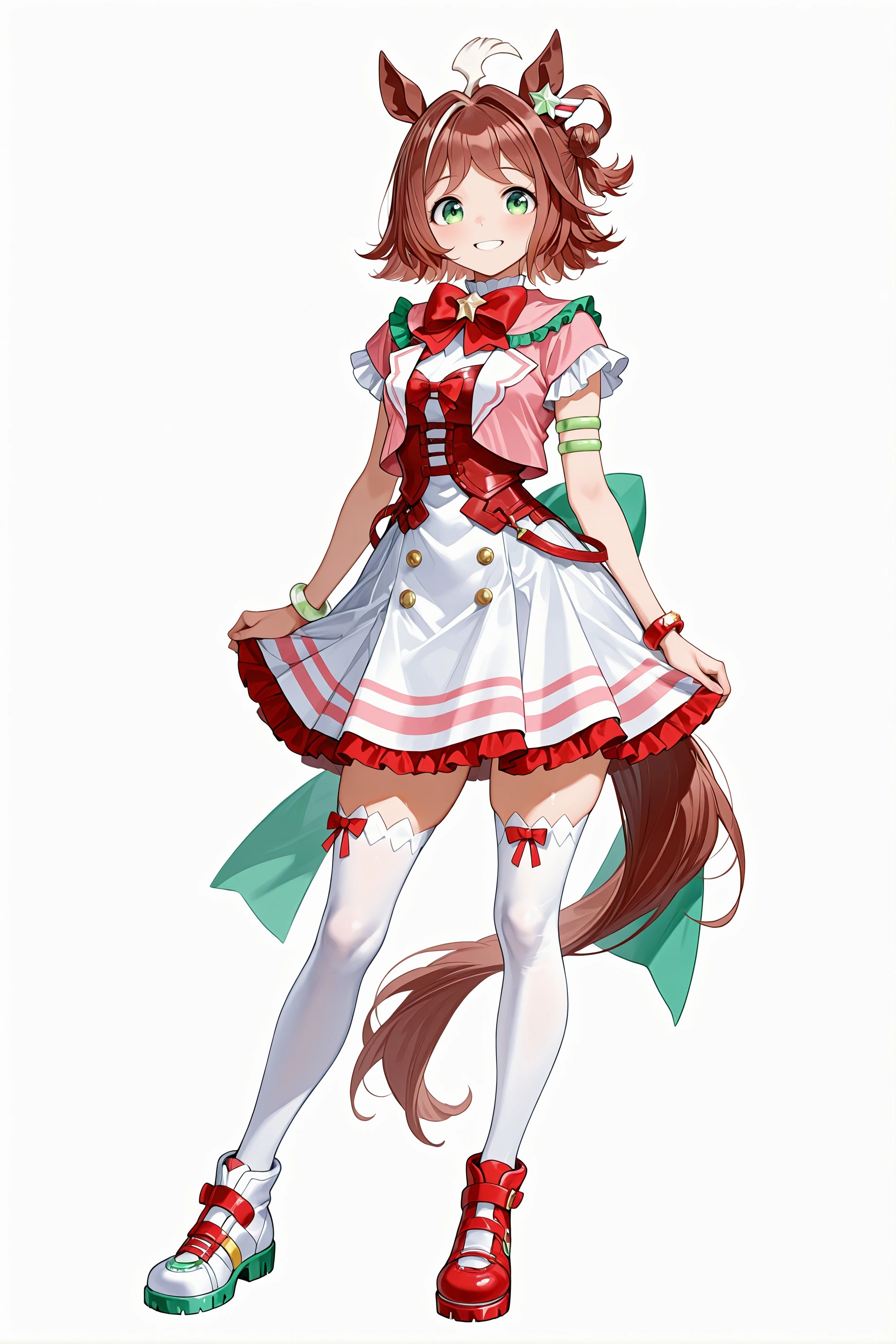 rhein kraft \(umamusume\), horse tail, horse girl, red bow, arm strap, bracelet, short sleeves, dress, white thighhighs, mismatched footwear, shoes,