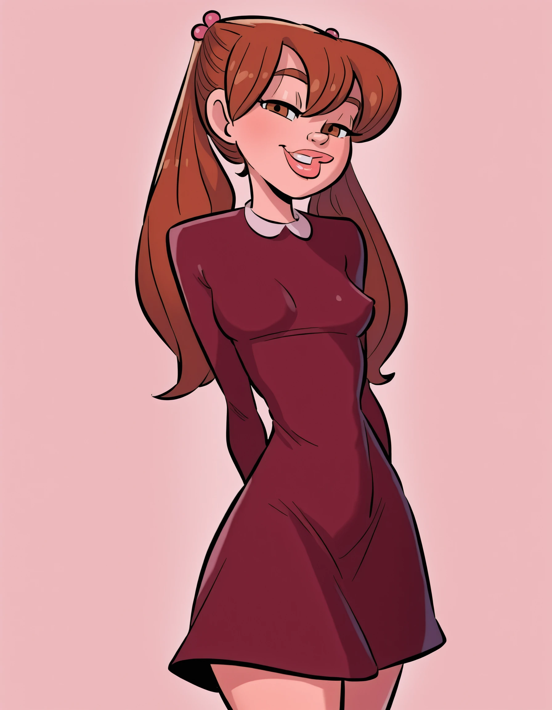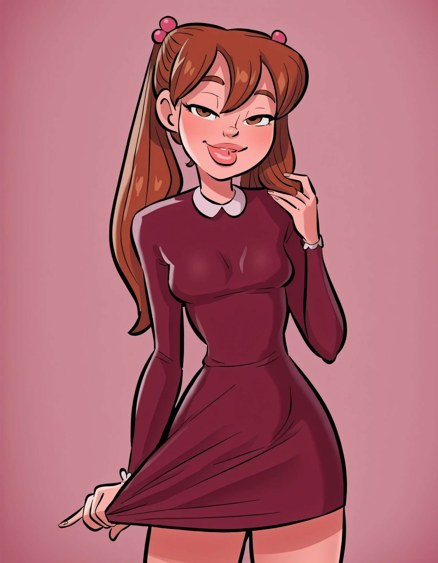 juliah, 1girl, brown hair, long hair, breasts, lips, twintails, hair ornament, hair bobbles,dress,long sleeves,kneehighs,20_style