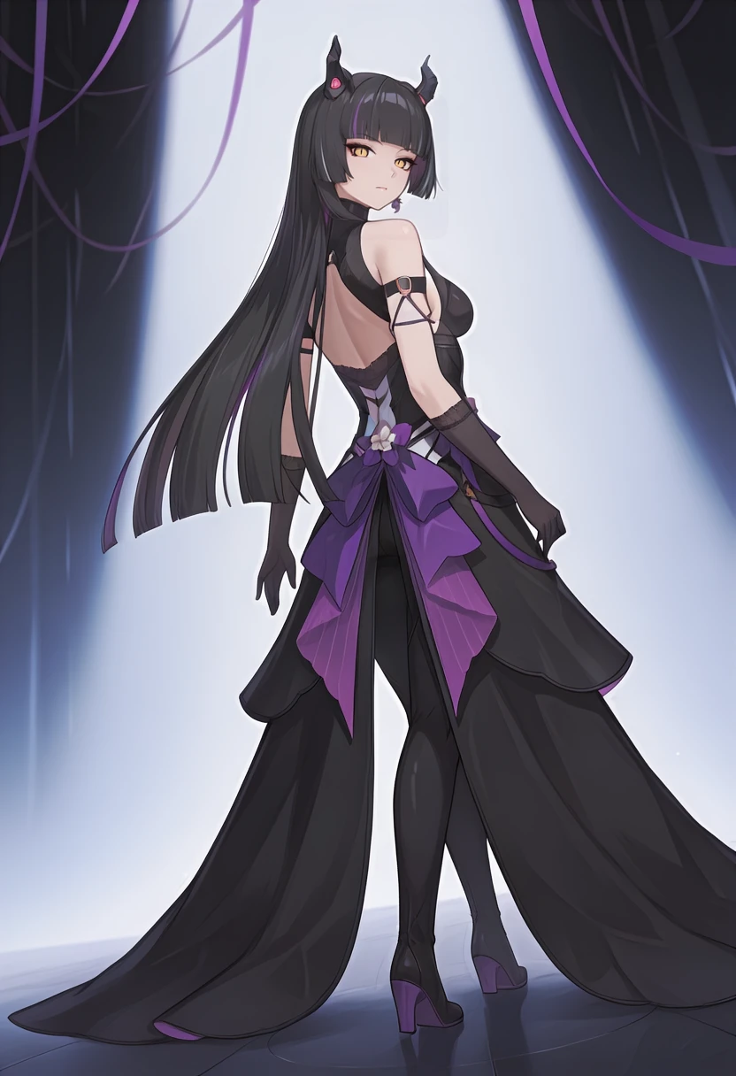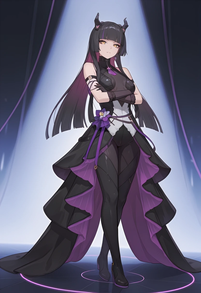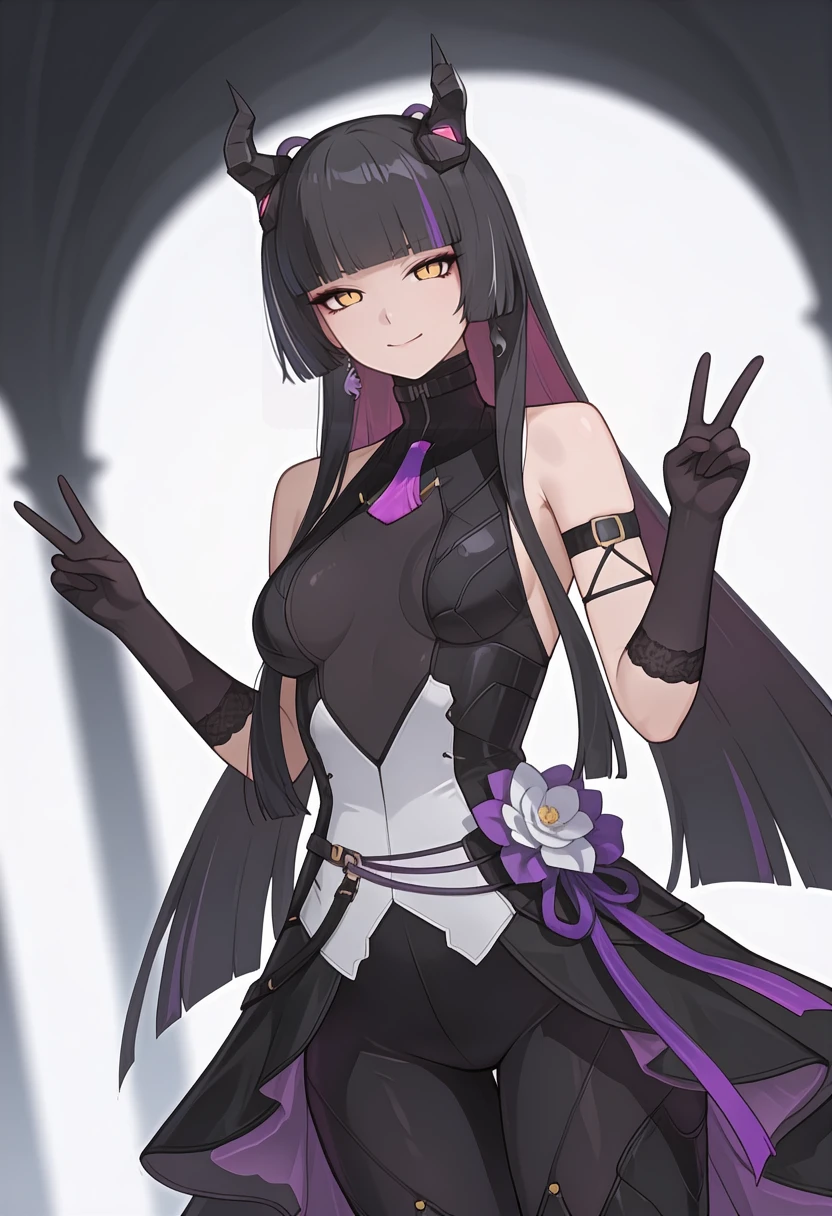 Appearance: czn_alcea, 1girl, medium breasts, eyeliner, yellow eyes, slit pupils, black pupils, very long hair,hime cut, black hair,two-tone hair, streaked hair, multicolored hair, colored inner hair, demon horns,black horns,single earring