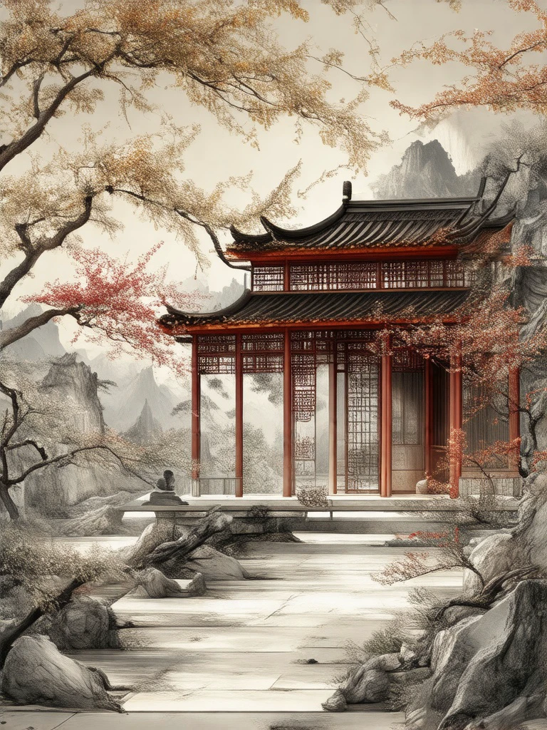 推荐提示词:Chinese design style, Captured from a high-angle perspective on a sunny day, a table is situated in front of a window. The table is made of a light- colored wood. The table is made of a light- colored wood
