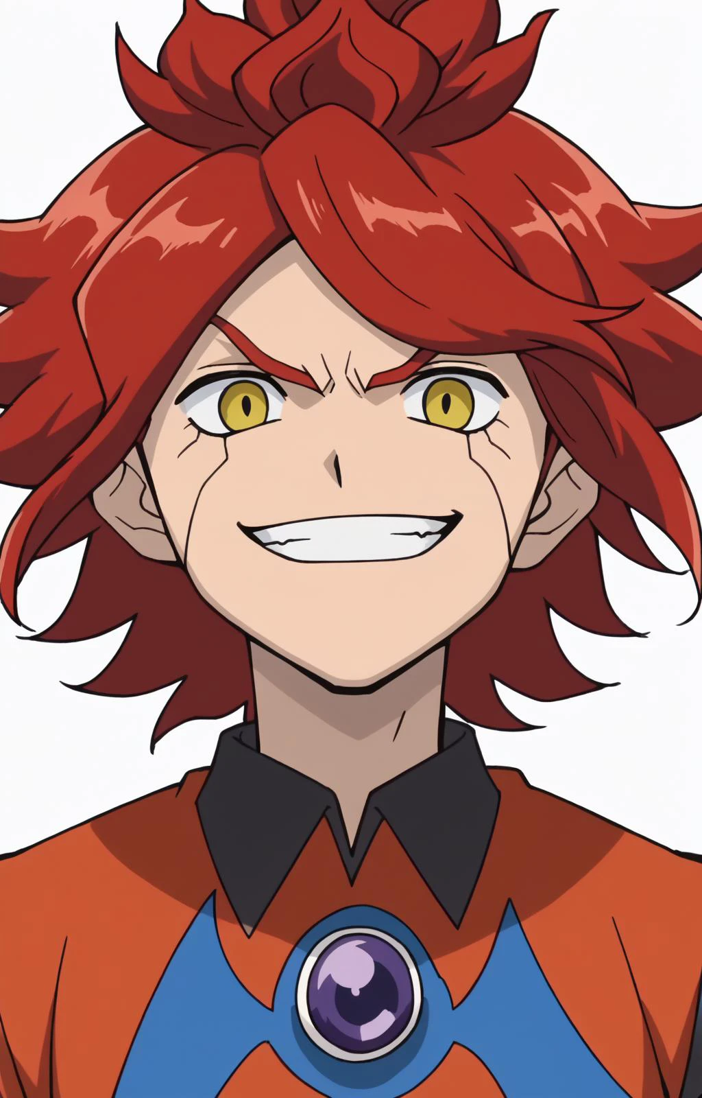 burnchaos, red hair, yellow eyes, short sleeves, black collared shirt, black shorts