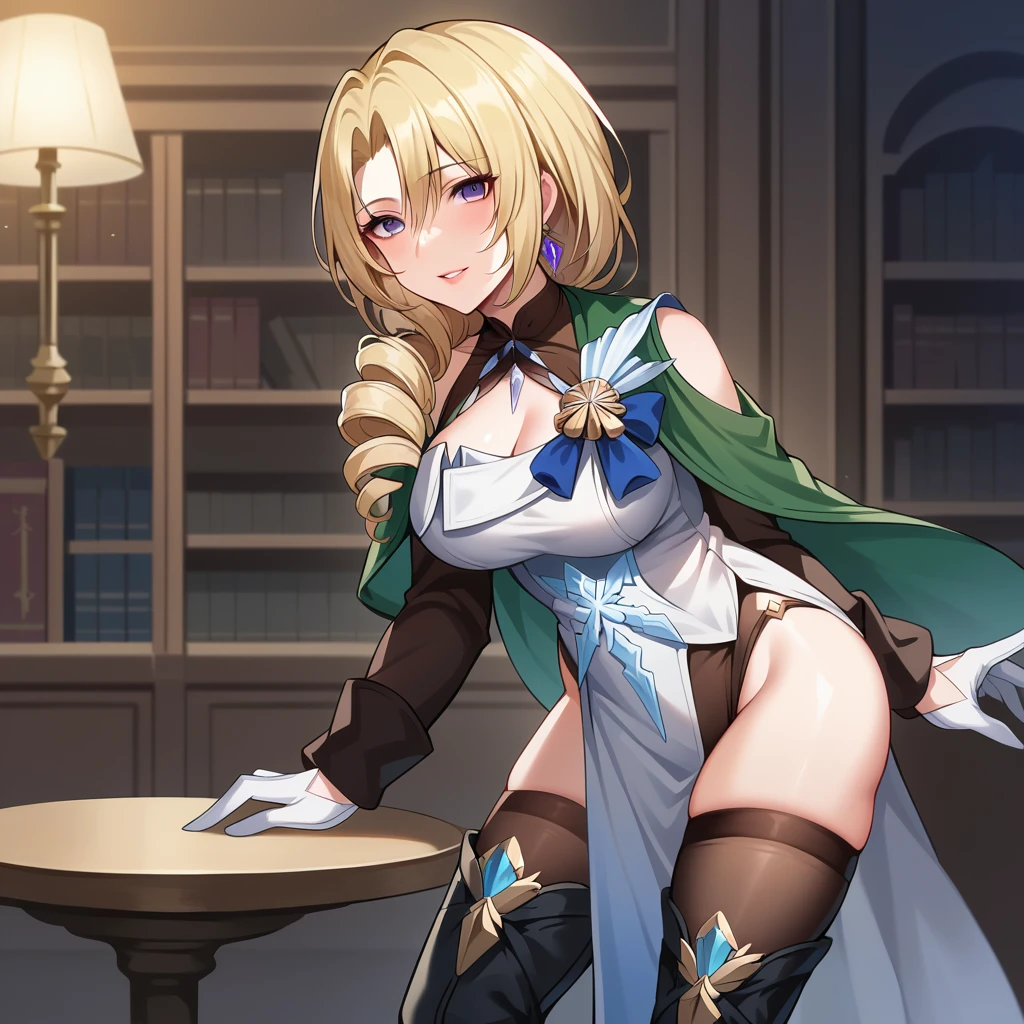 white dress, strapless dress, white pelvic curtain, brown leotard, leotard under clothes, jewelry, snowflake ornament, thigh cutout, shoulder cutout, clothing cutout, cleavage cutout, green capelet, white gloves, mismatched gloves, halterneck, thigh strap, black thighhighs, medium sleeves, brown sleeves,Extra Info: So I've tried to train it with "pantyhose, thigh cutout, hip vent", didn't work. So I trained with "black thighhighs, thigh cutout". Is it perfect ? No. Does it look appealing enough to anyone who is interested in the Character ? Probably Yes.