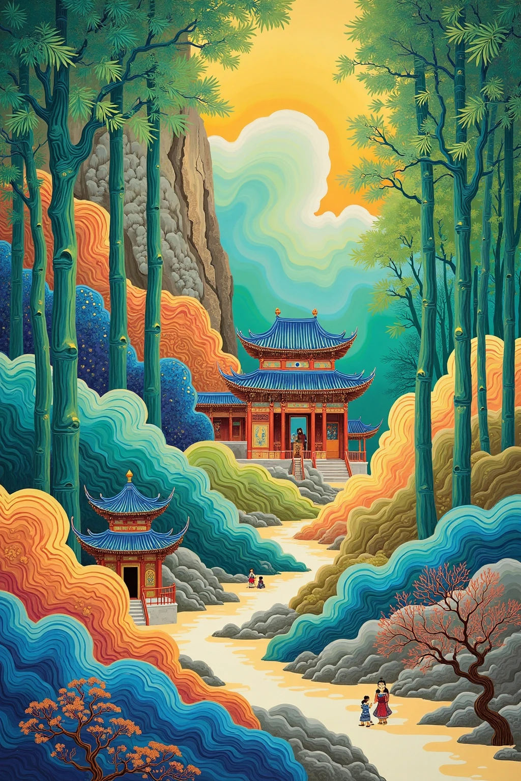 Rich colors and traditional Chinese landscape elements, form a bamboo forest retreat, with winding paths, a small stream, and a scholar’s study hidden among the green.