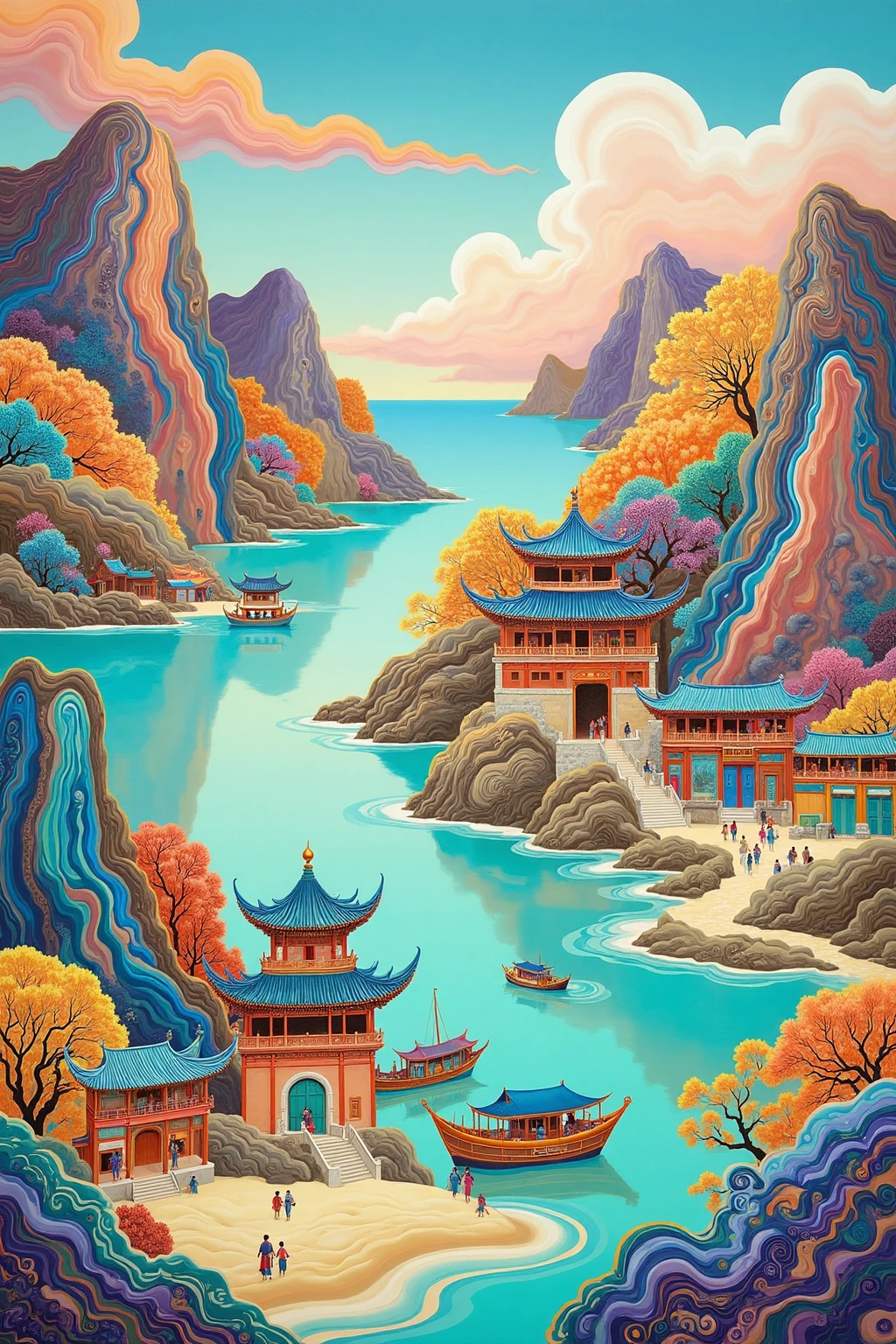 Rich colors and traditional Chinese landscape elements, build a coastal fishing village, where colorful sails dot the sea, and a temple overlooks the bustling dock.