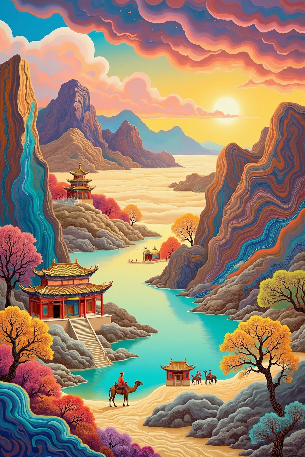 Rich colors and traditional Chinese landscape elements, craft a desert - edge oasis, where a pagoda stands by a clear spring, and camels trek under a fiery sunset.