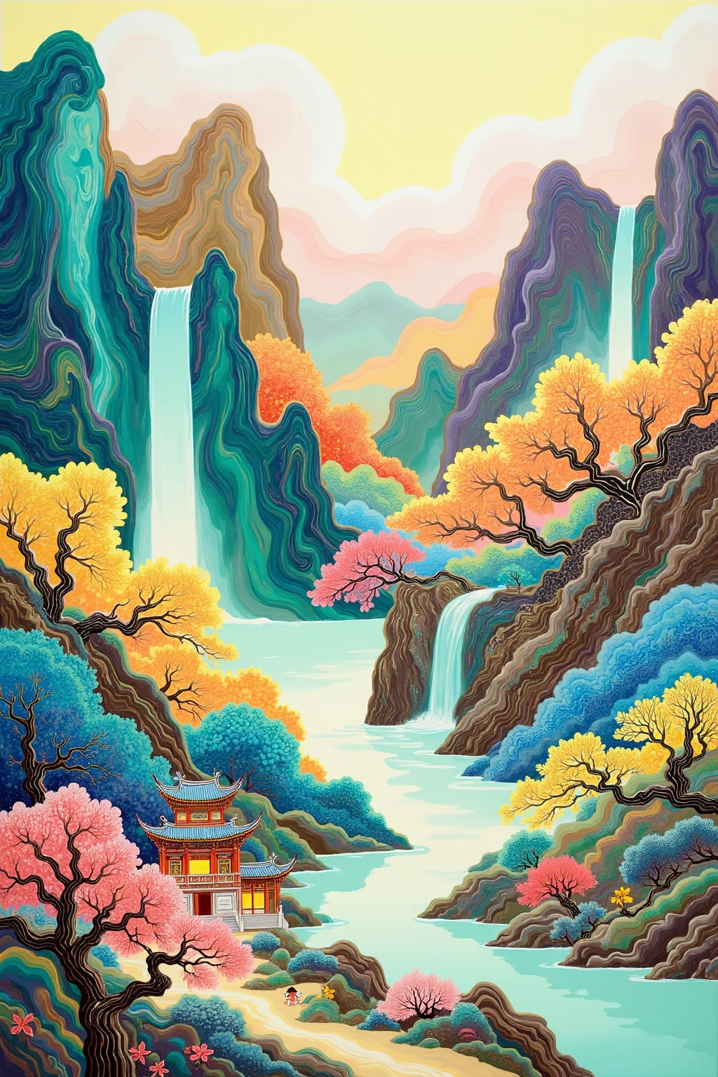 Rich colors and traditional Chinese landscape elements, make a spring valley with blooming flowers, waterfalls pouring down green cliffs, and a hidden thatched cottage.