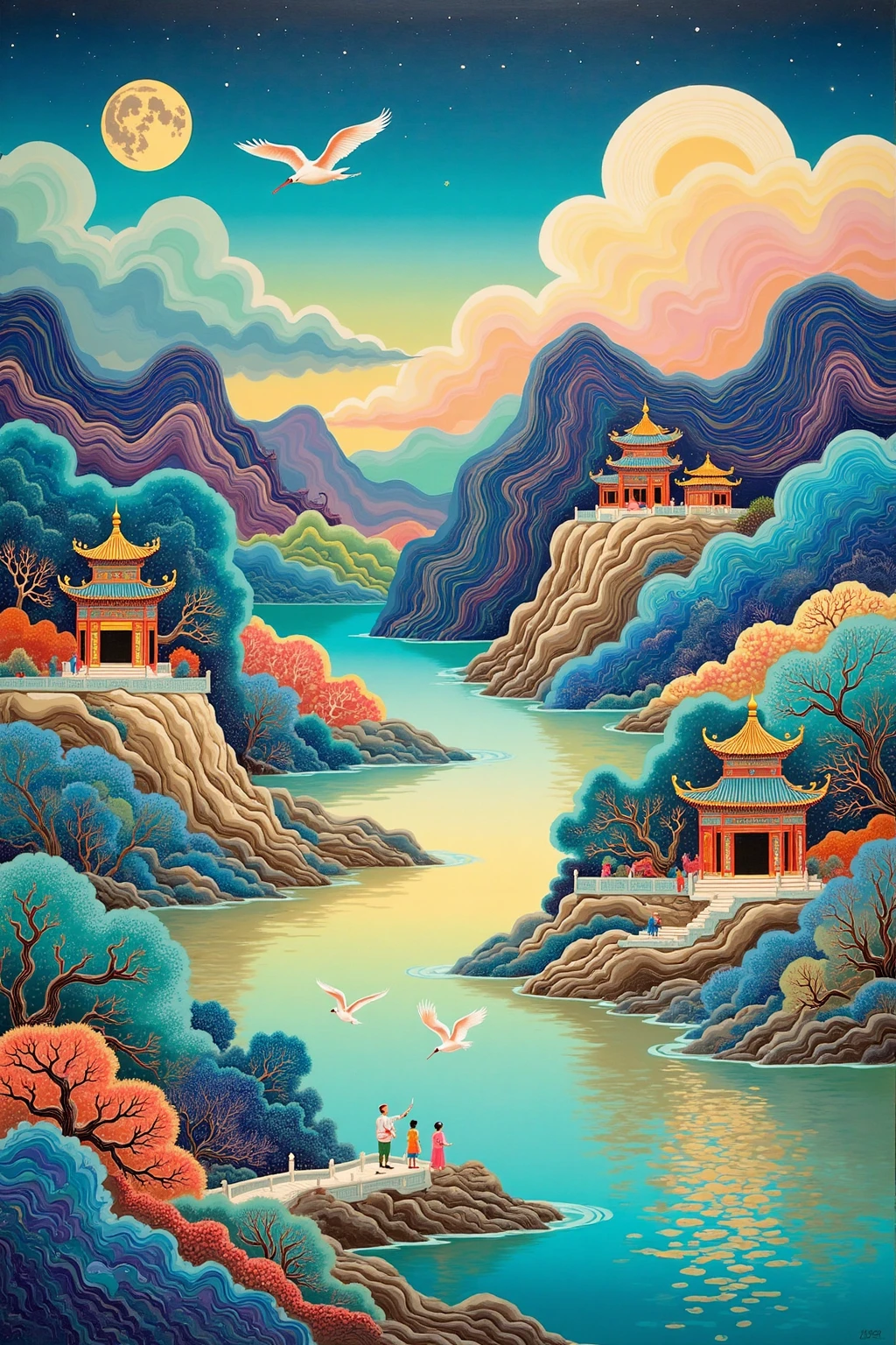 Rich colors and traditional Chinese landscape elements, depict a moonlit lake surrounded by ancient pavilions, with cranes flying and silver waves rippling.