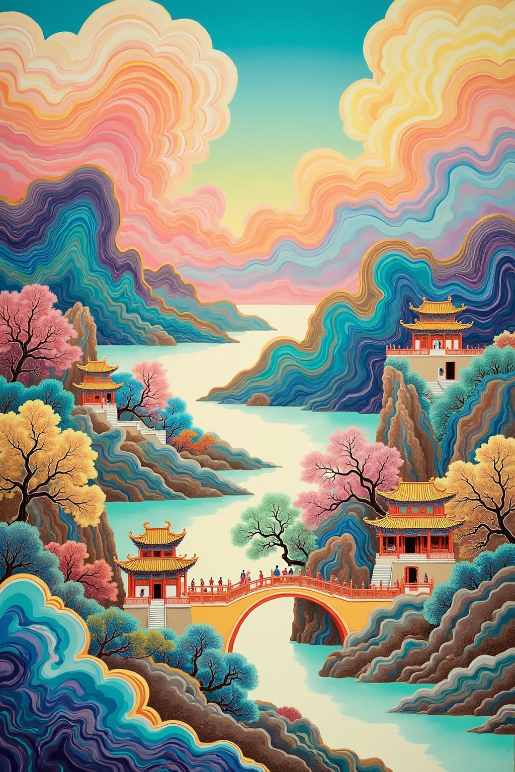Rich colors and traditional Chinese landscape elements, imagine a celestial realm, where palaces float among colorful clouds, and immortals stroll on misty bridges.