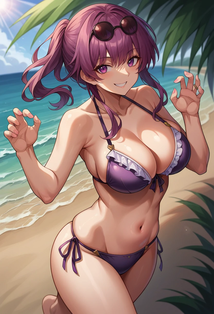 Outfit 1: ["kfka, purple eyes, purple hair, bangs, eyewear on head, sunglasses, white shirt, black pantyhose, purple gloves, black shorts, high-waist shorts, long sleeves, jewelry, jacket, straps, single thigh boot"]