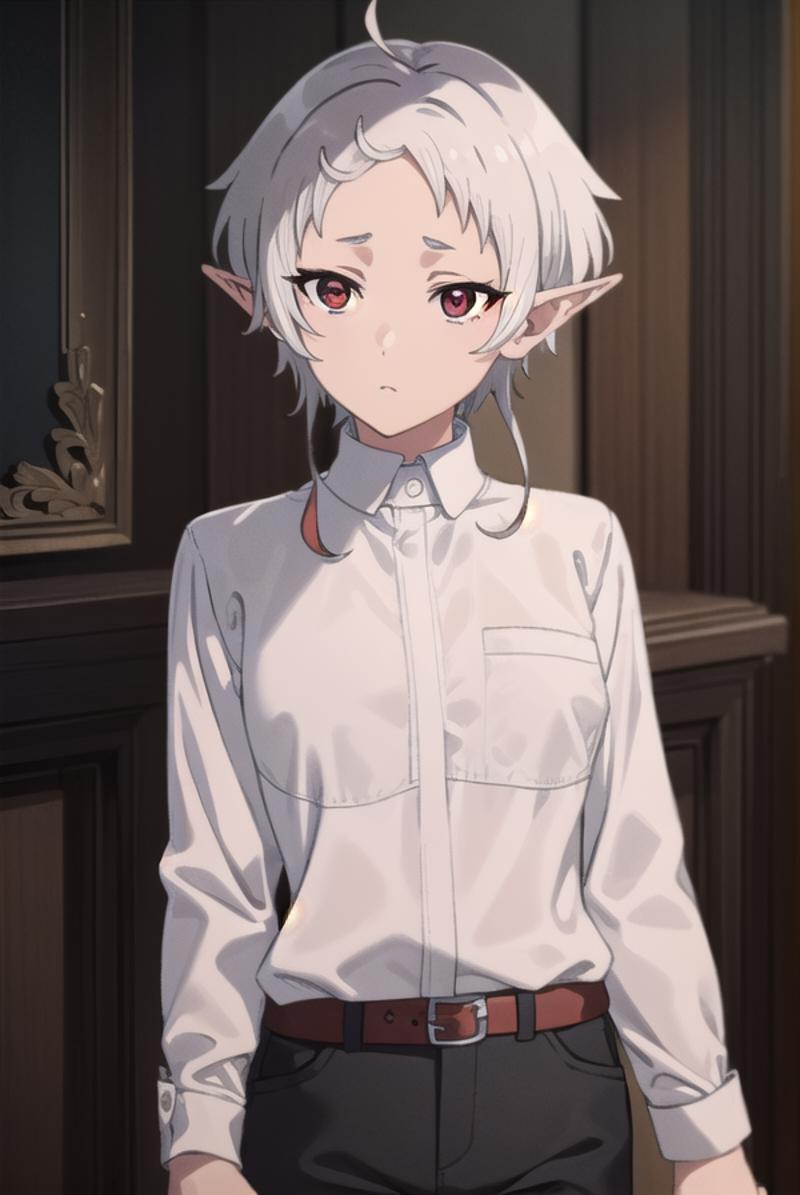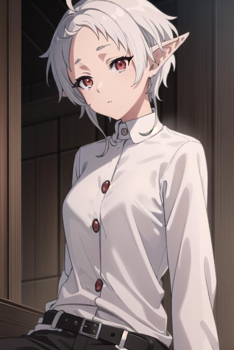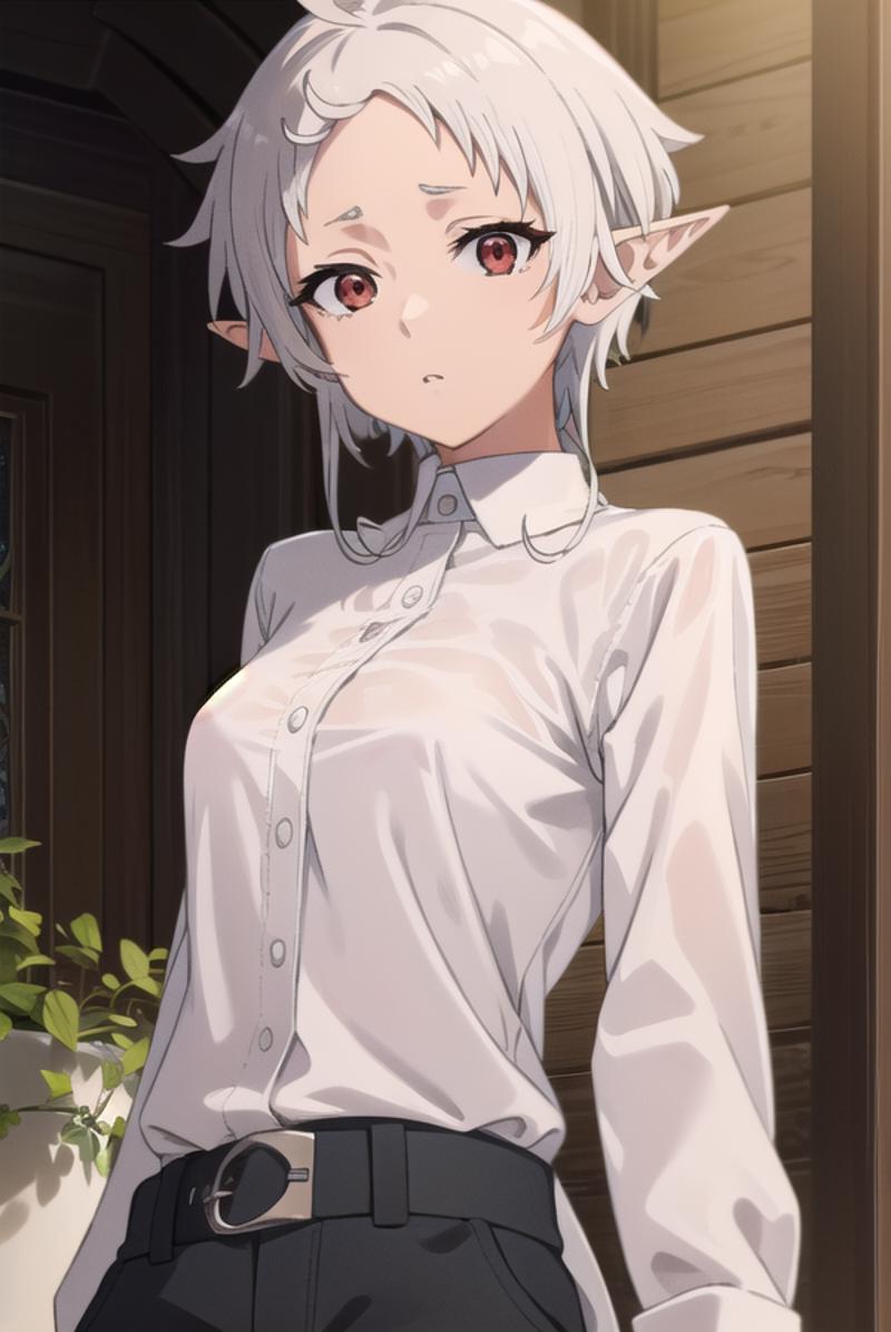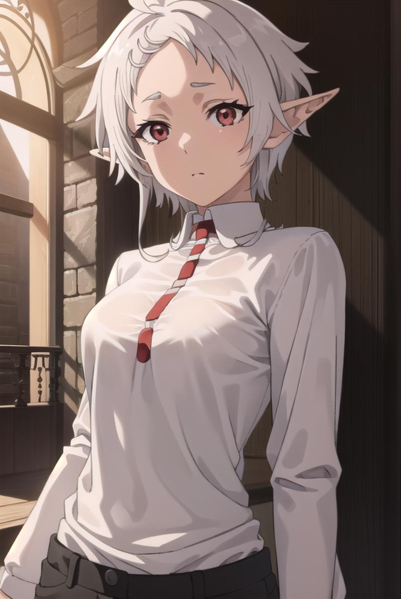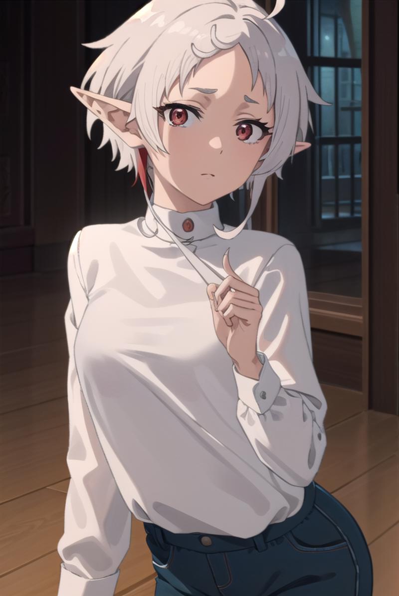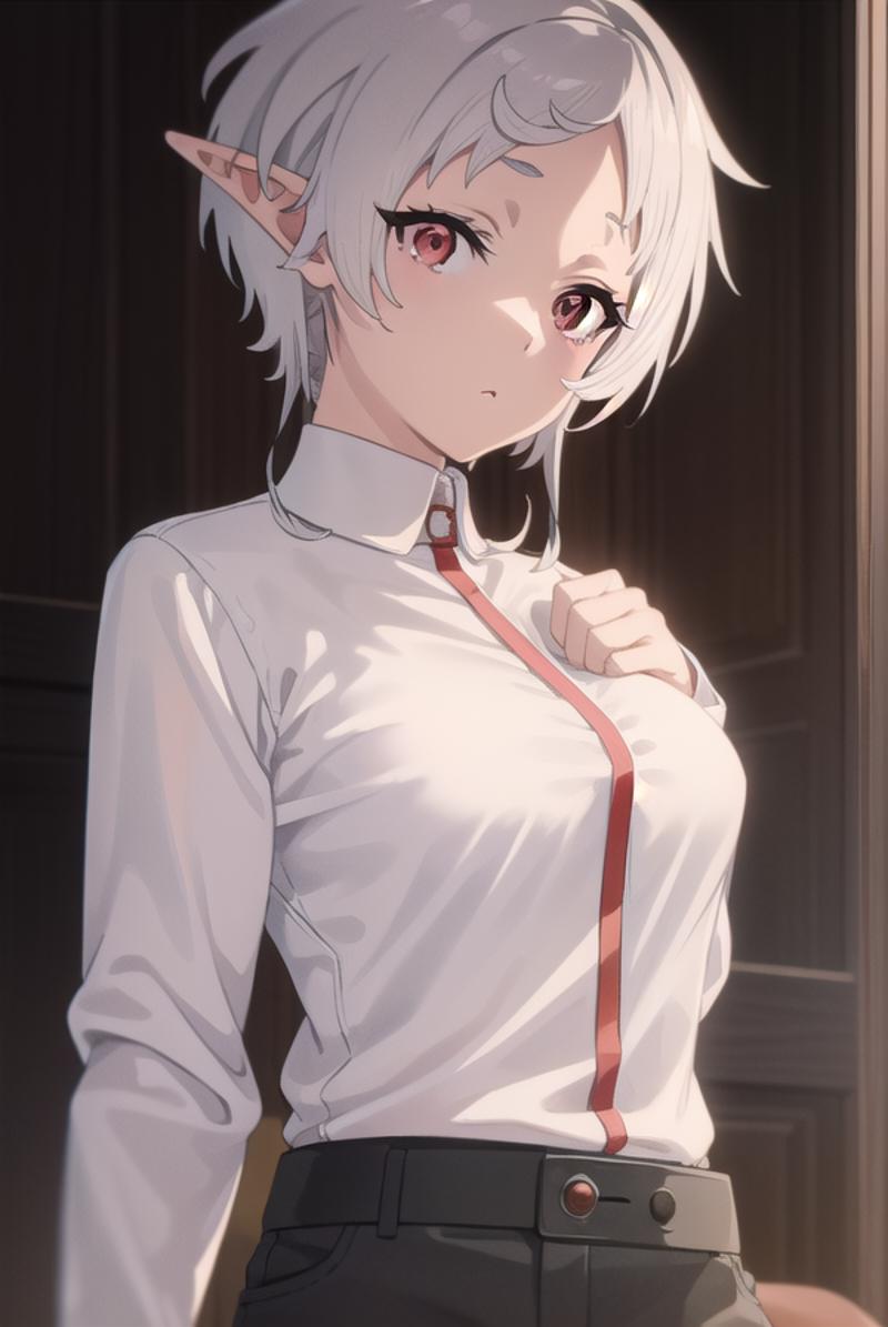 sylphy, short hair, ahoge, white hair, pointy ears, (red eyes:1.5), elf,