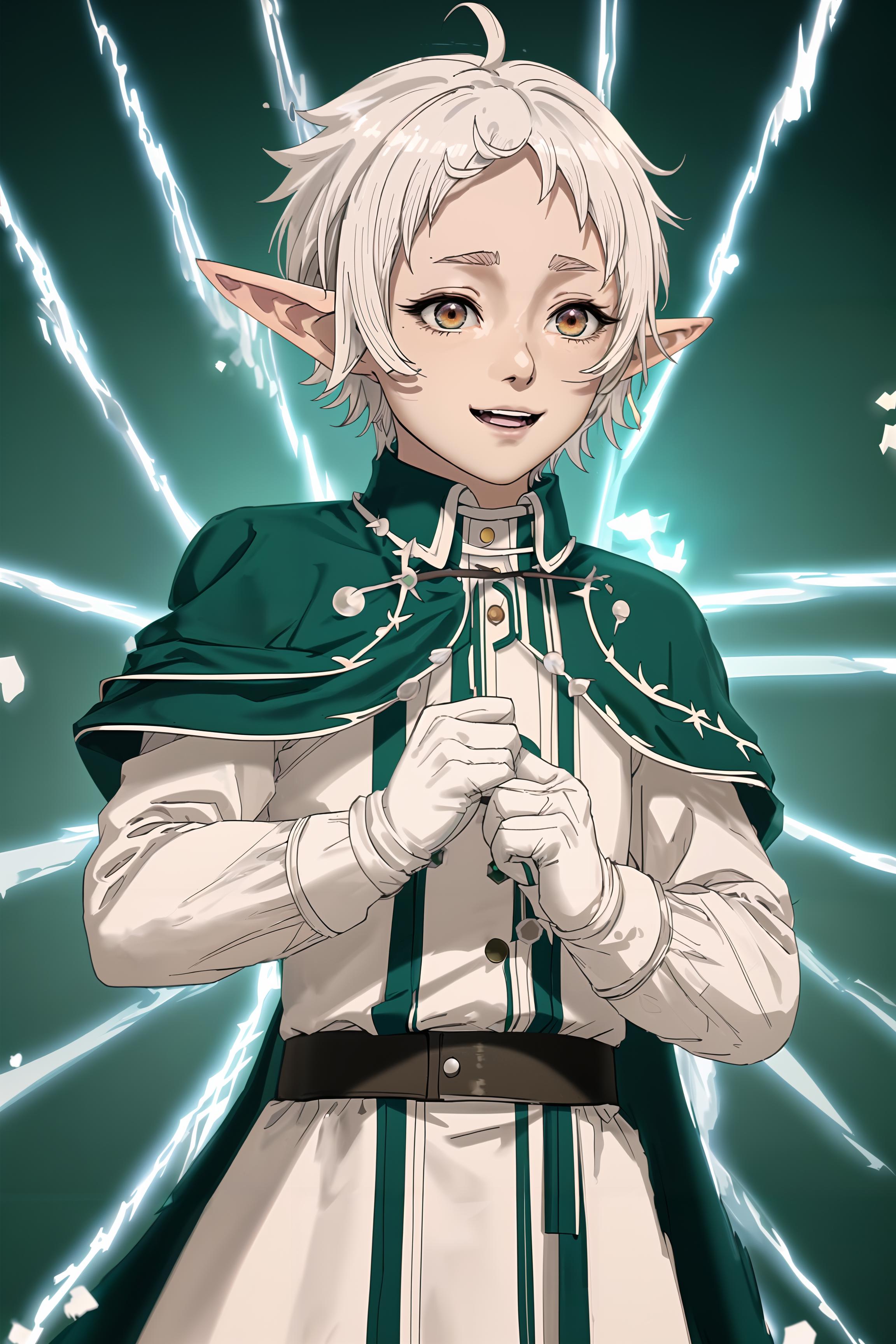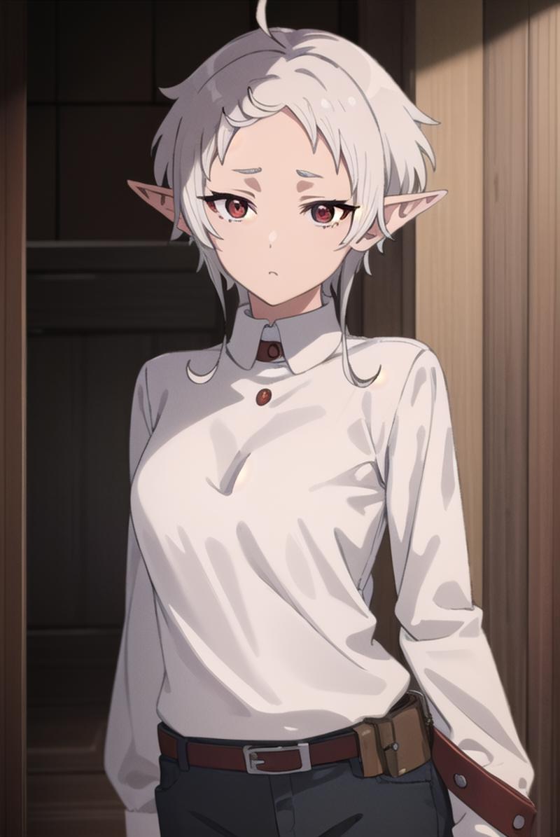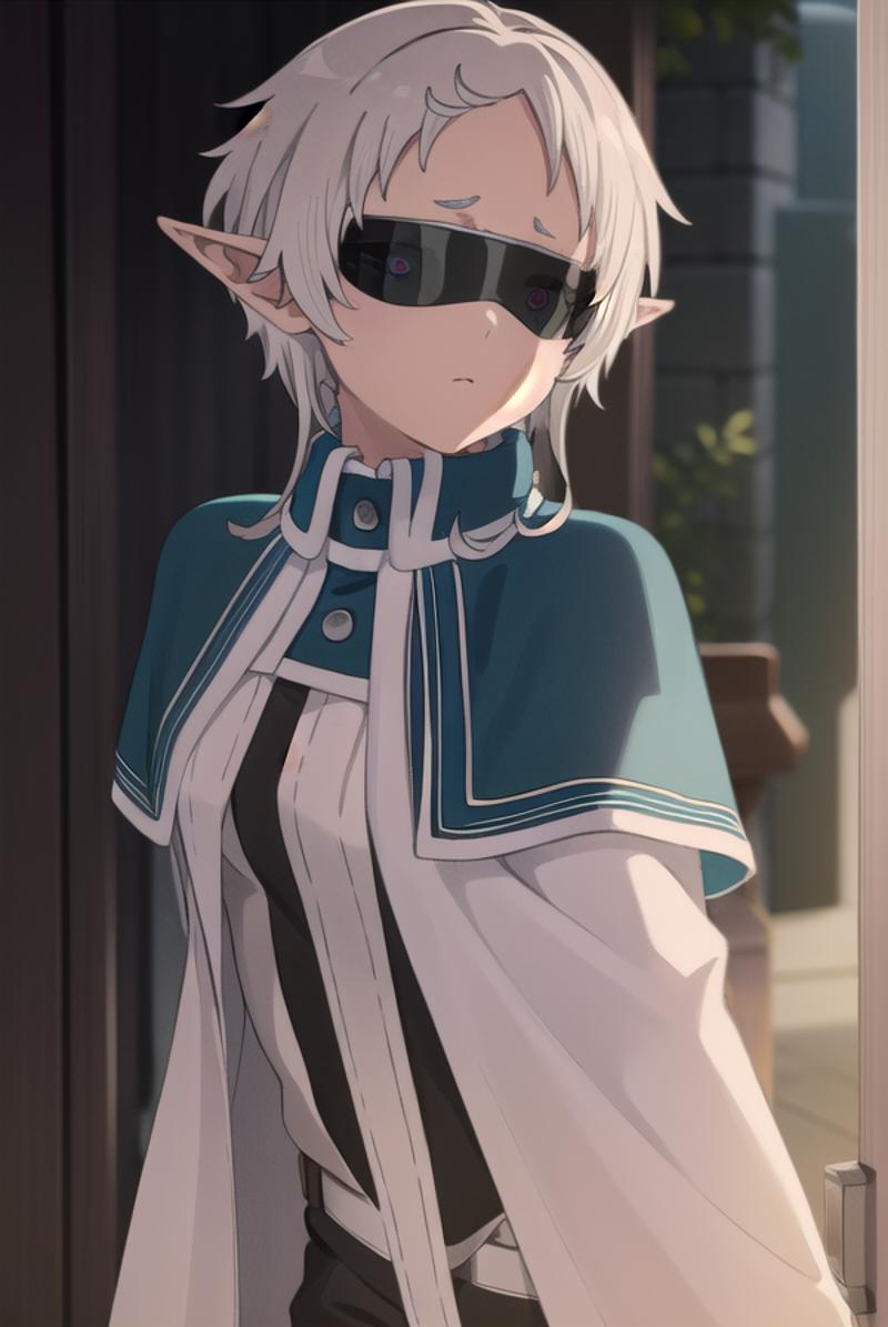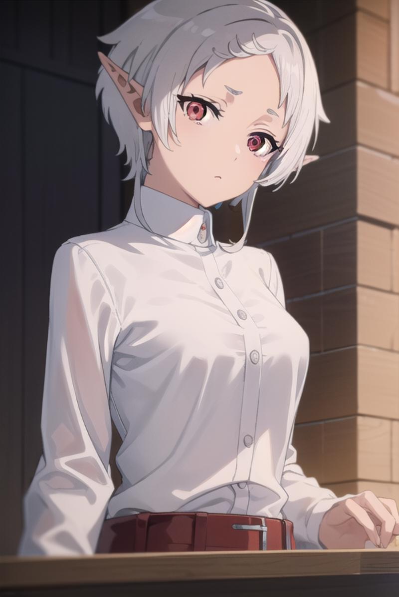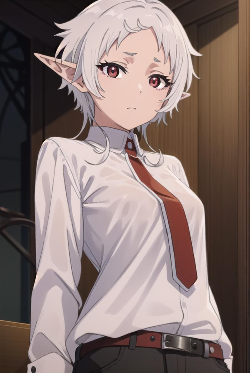 sylphy, short hair, ahoge, white hair, pointy ears, (red eyes:1.5), elf,
