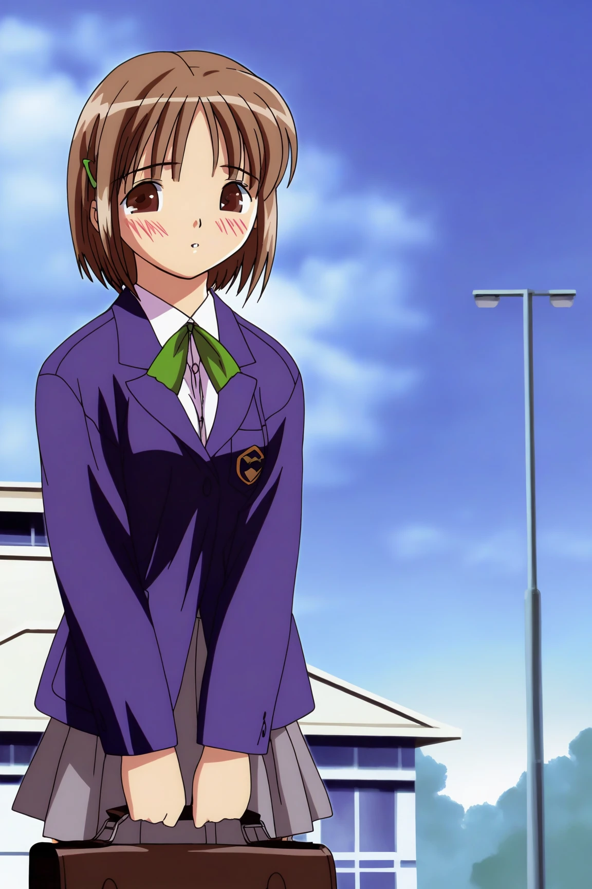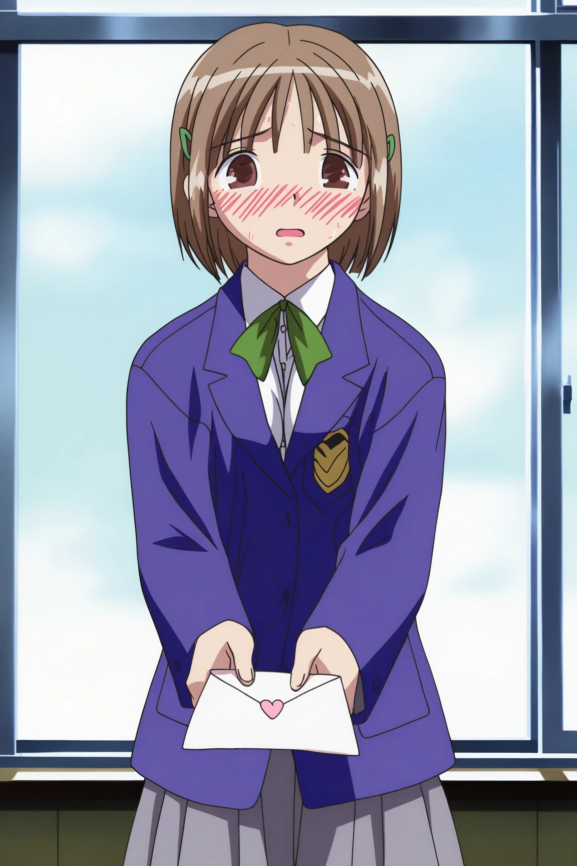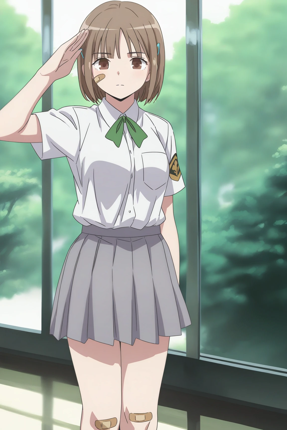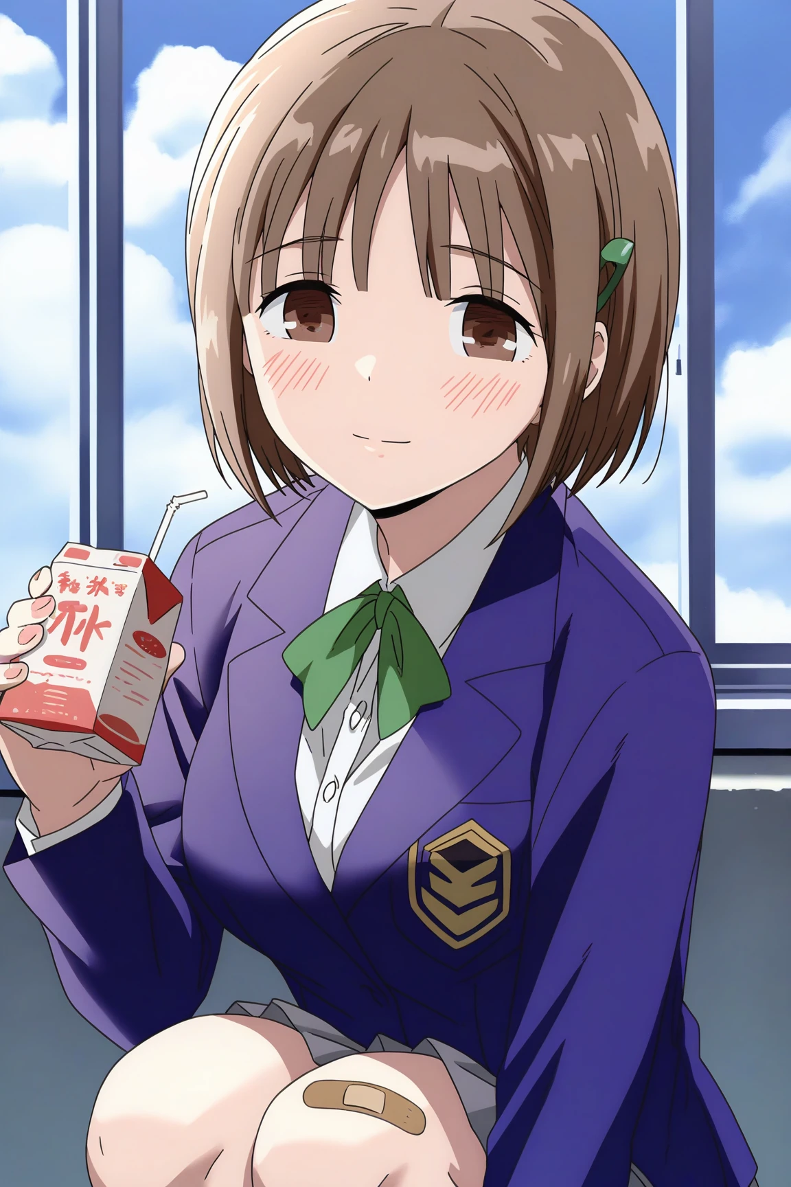 chise_wz, short hair, brown hair, hair ornament, brown eyes, medium breasts, neck ribbon, green ribbon, blue blazer, collared shirt, grey skirt, pleated skirt, school uniform, 2000s \(style\)