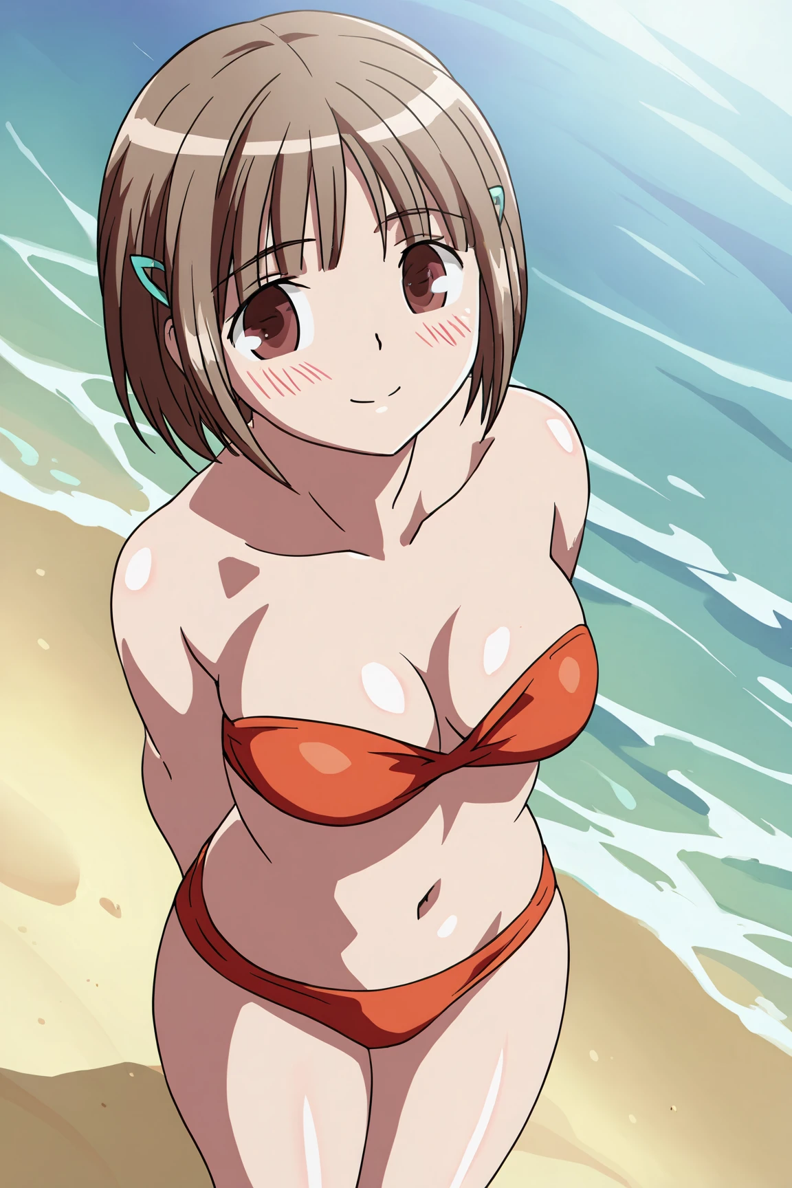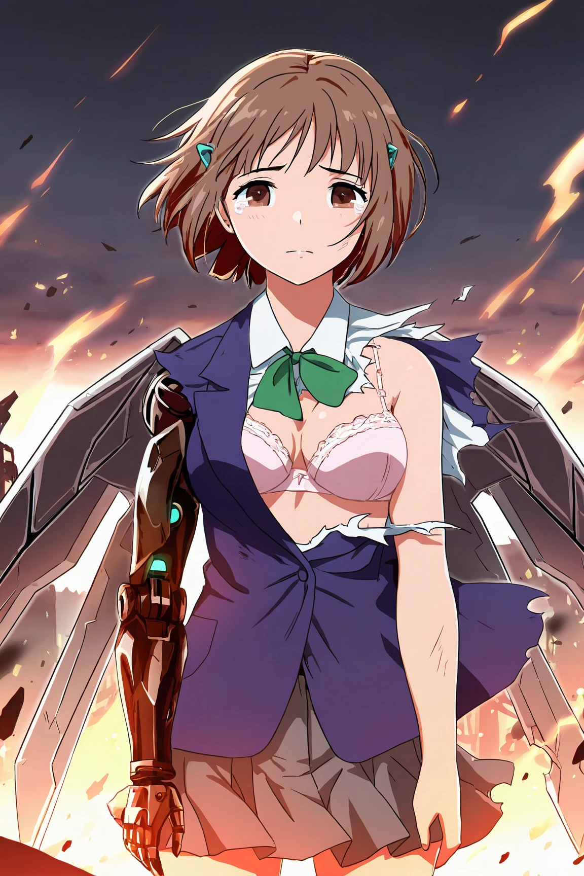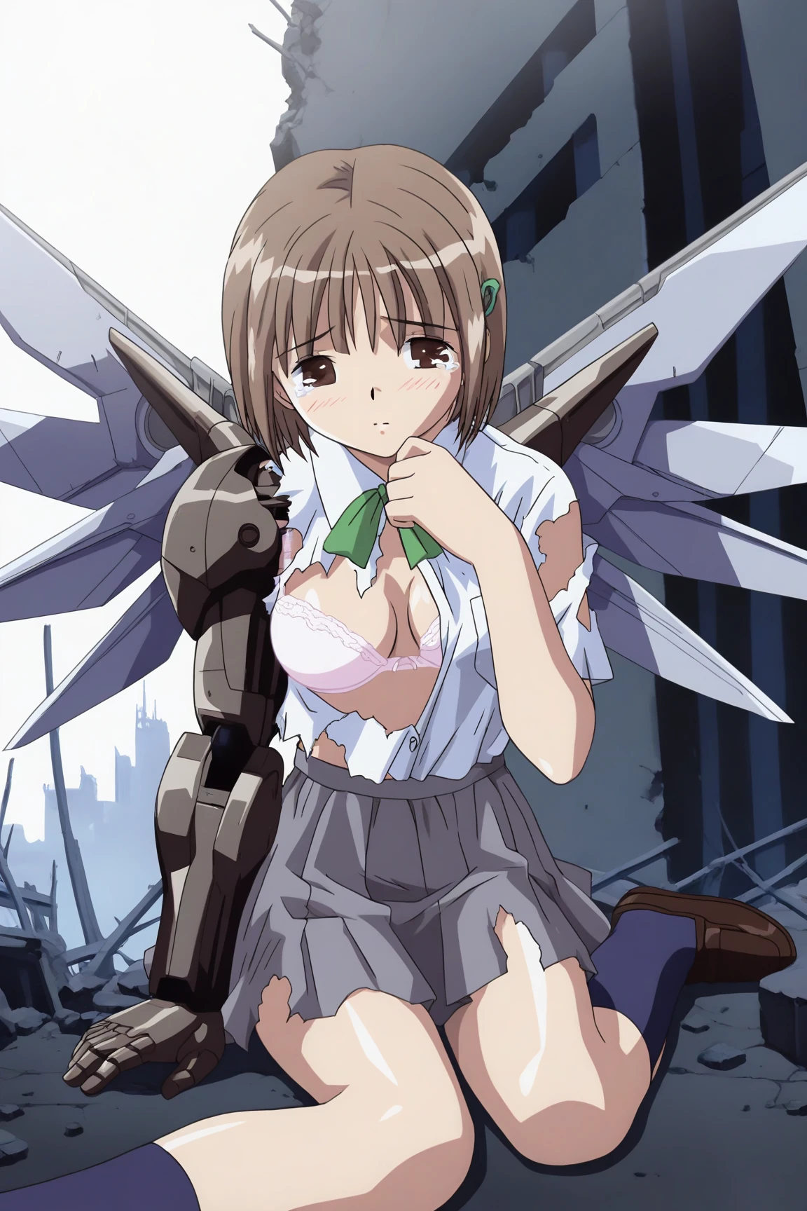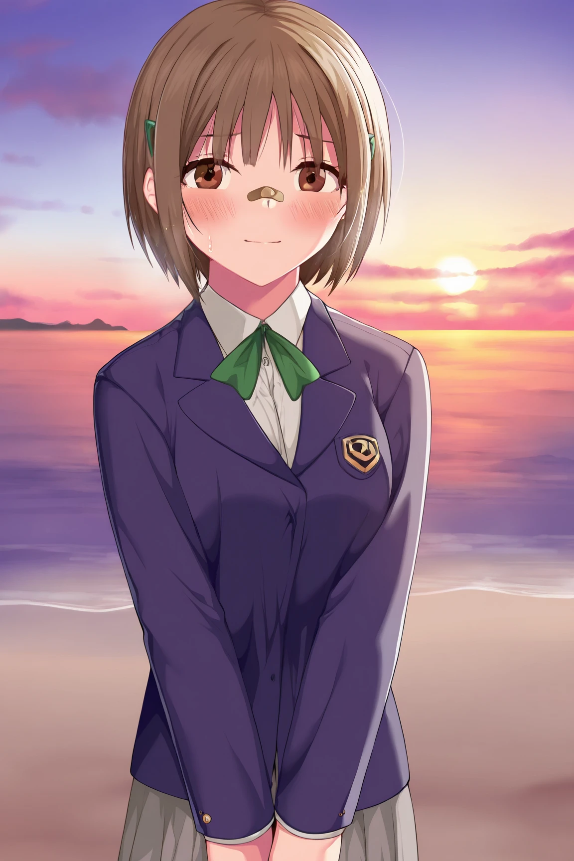 chise_wz, short hair, brown hair, hair ornament, brown eyes, medium breasts, neck ribbon, green ribbon, blue blazer, collared shirt, grey skirt, pleated skirt, school uniform, 2000s \(style\)