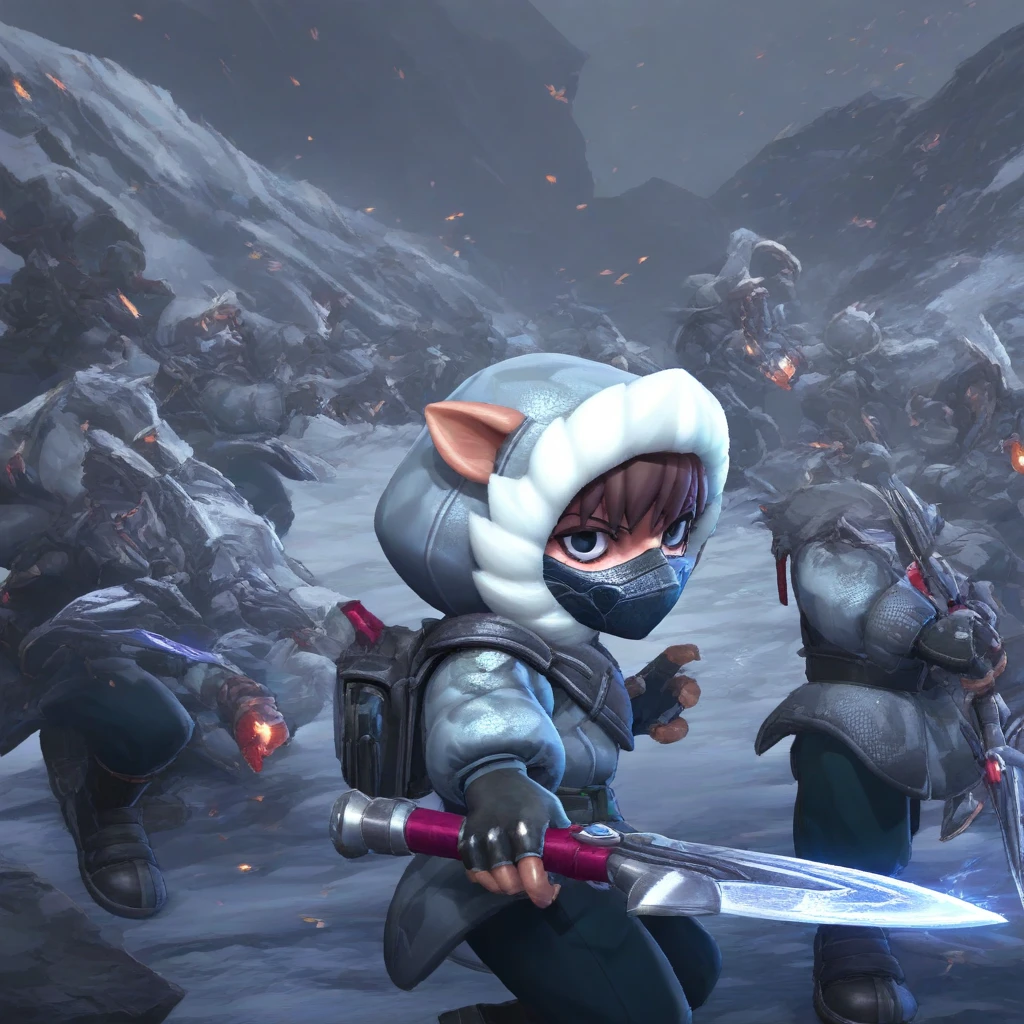 red hair , short hair , tan fur, tan body , tan skin ,cat hood,pouch,fur-trimmed hood,fur trim, gloves, animal ears, mask,