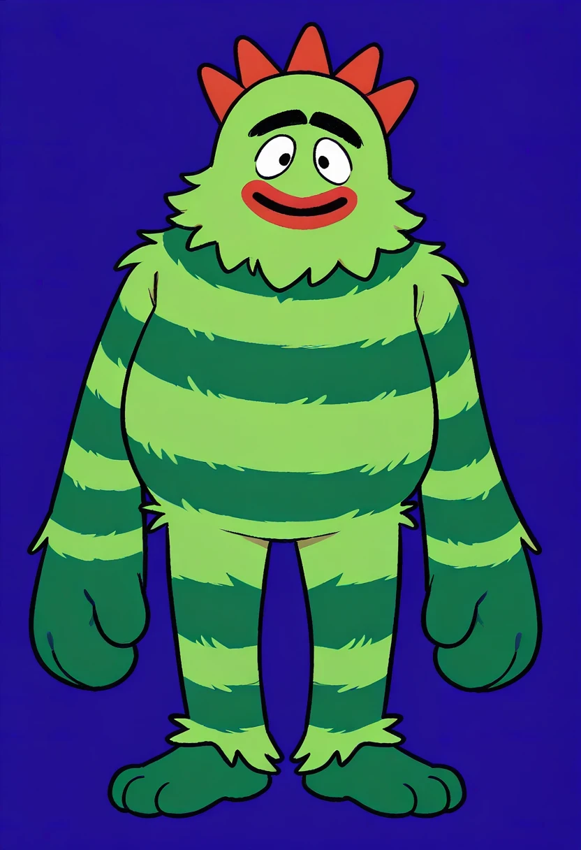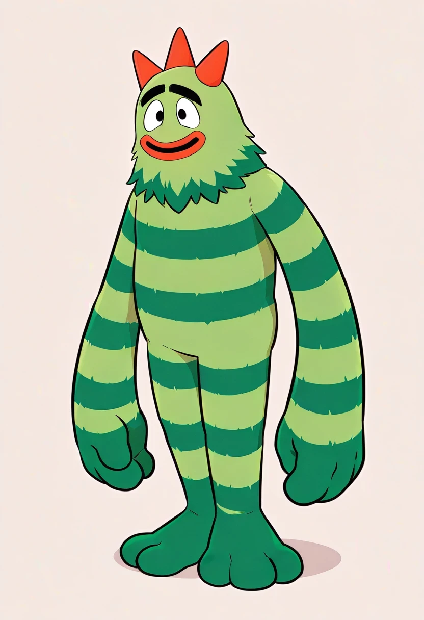 BrobeeYGG, 1boy, black eyes, green fur with horizontal dark green stripes across body, dark green feet, dark green hands, three bright red horns on the top on head, large black unibrow, big red lips, very long arms