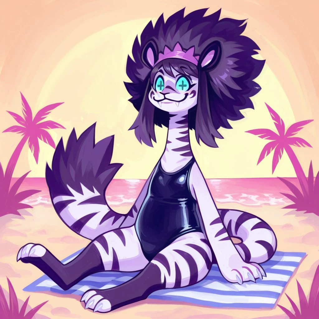 tiger, white and black fur, striped fur, black hair, afro, long neck, claws, fangs, long tail, cross shaped pupils, hairband