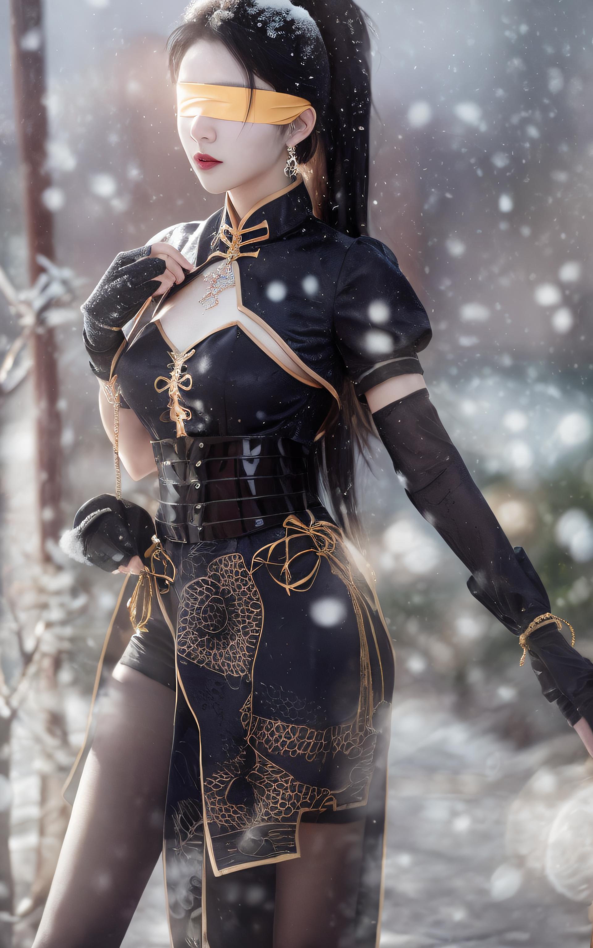 blindfold, ninghongye, 1girl, solo, black hair, chinese clothes, ponytail, pantyhose, gloves, long hair, china dress, breasts, jewelry, cleavage, fingerless gloves,