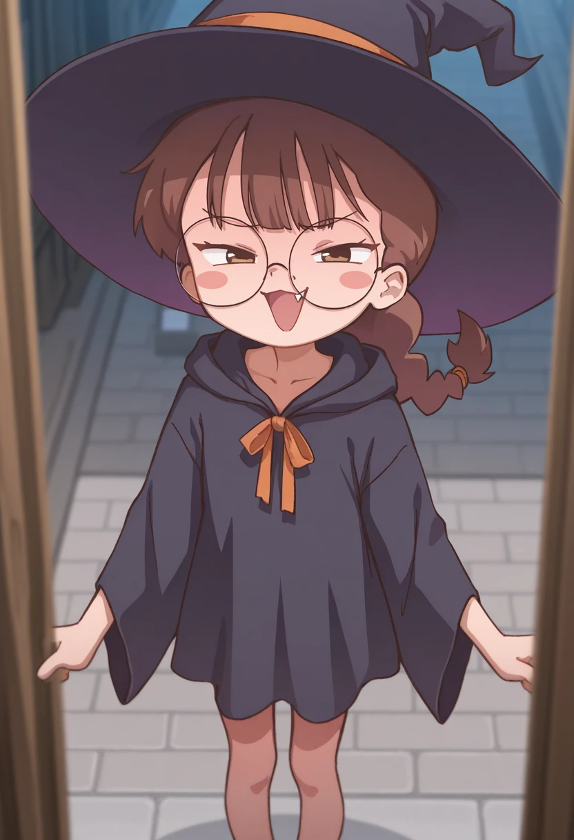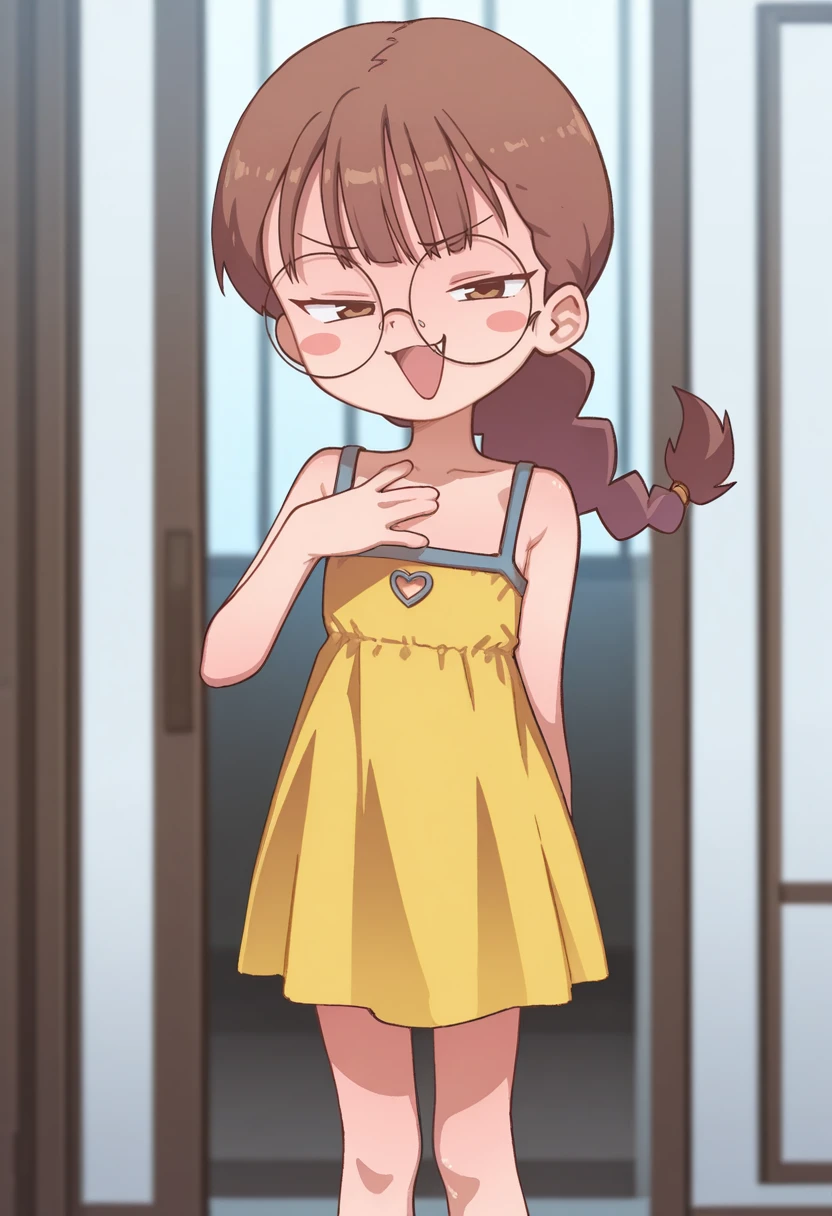 orenji, brown eyes, glasses, brown hair, braid, blush stickers/marks, white dress, fang, smug,