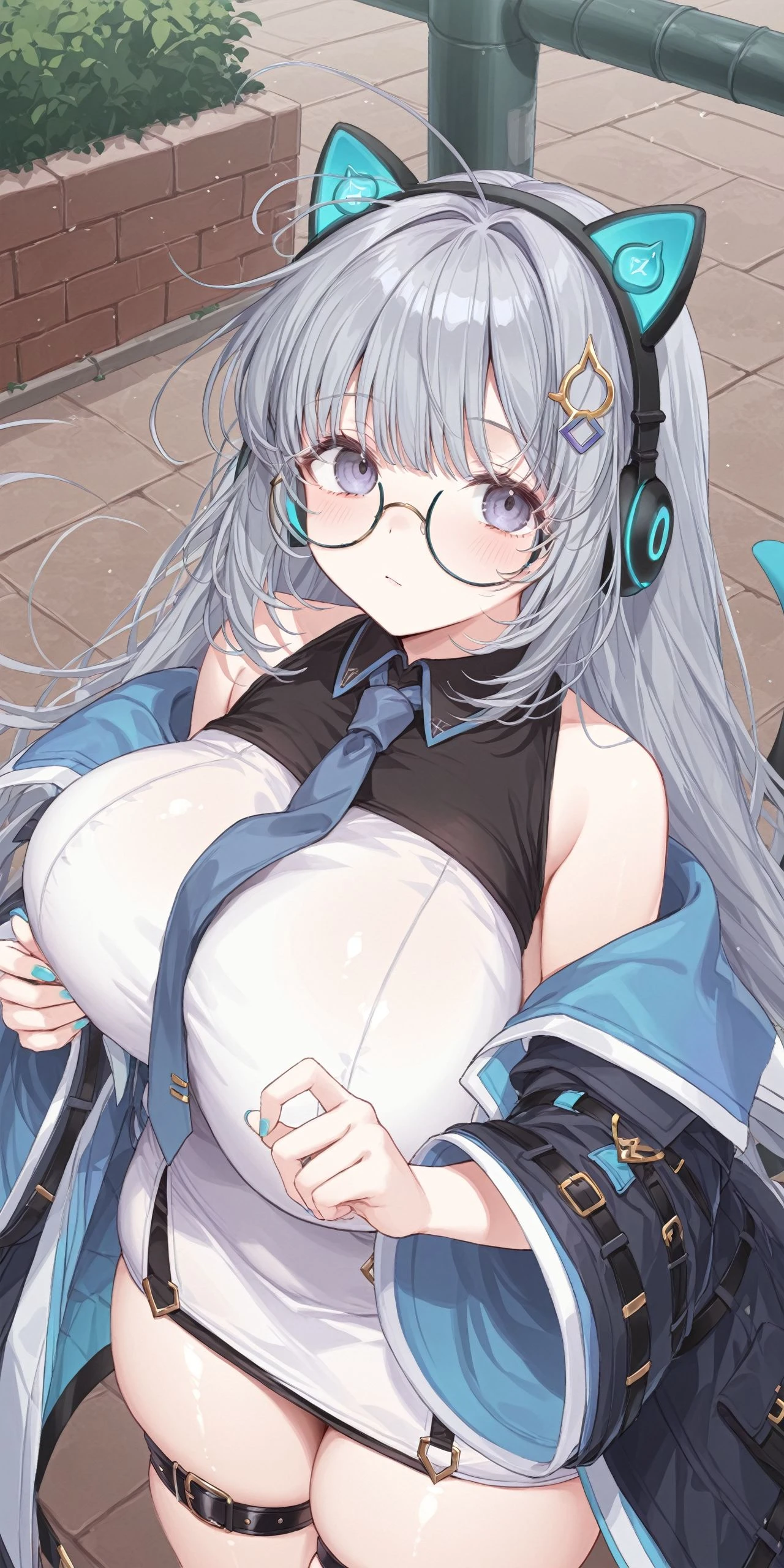 Erica-Main,ark re:code,sleeveless short dress,jacket,tail,necktie,glasses,wide sleeves,off shoulder,nail polish,black panties,skindentation,thigh strap,animal ear headphones,