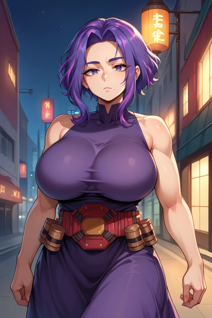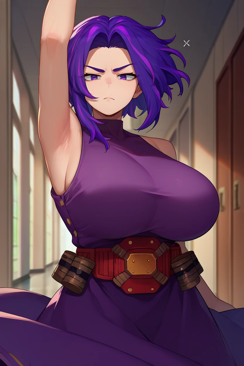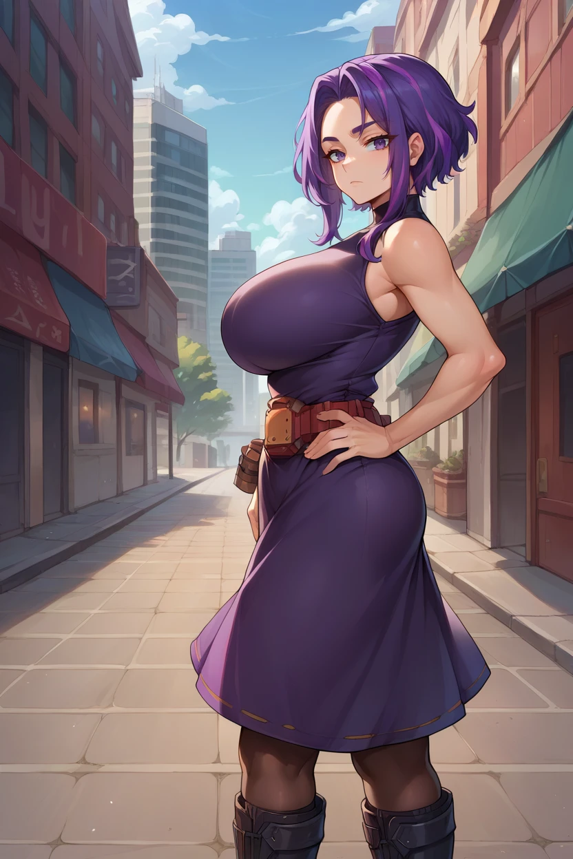 Add "purple dress, belt, sleeveless, pantyhose" for her typical look.