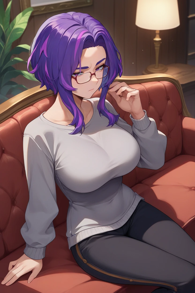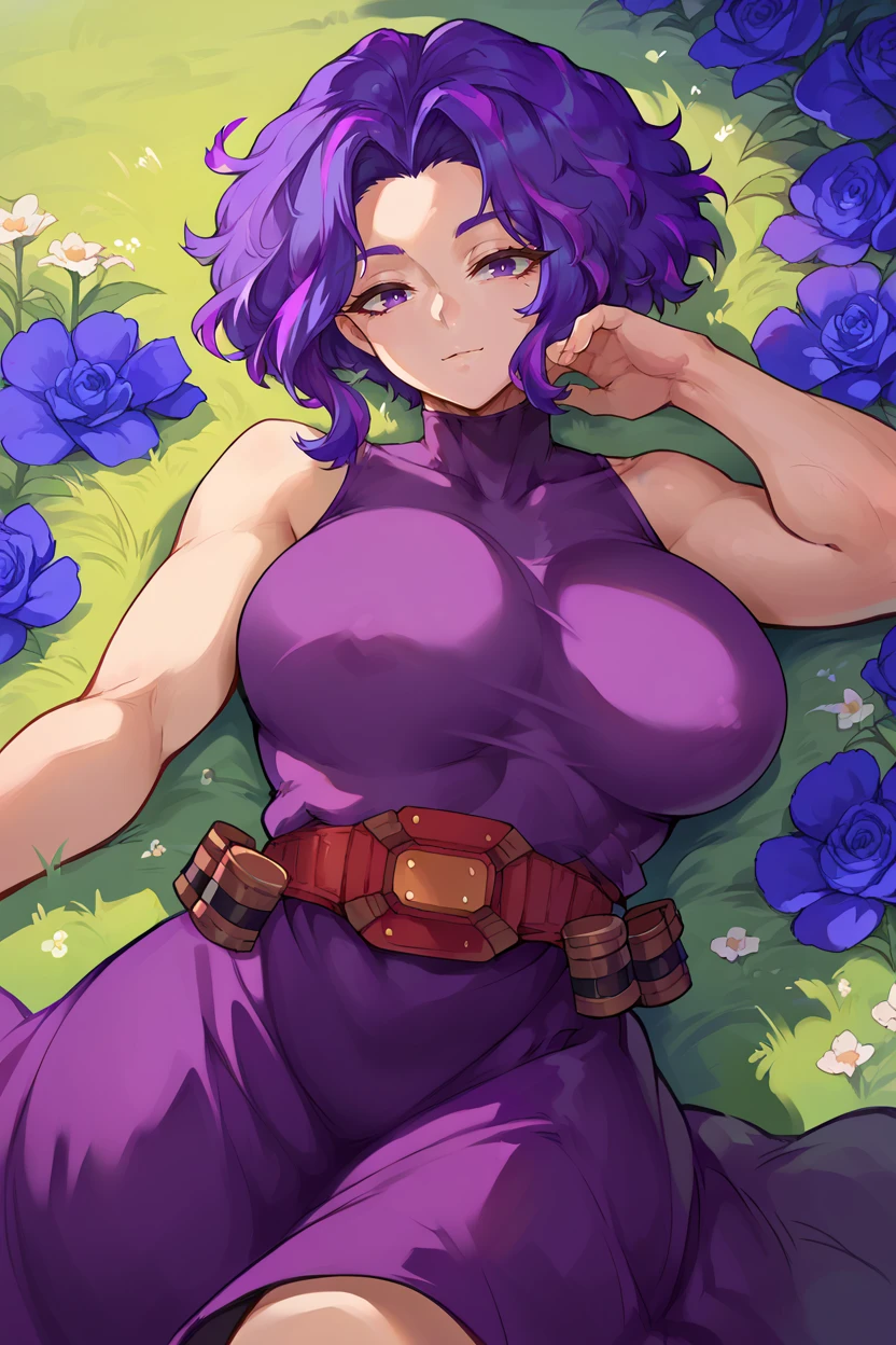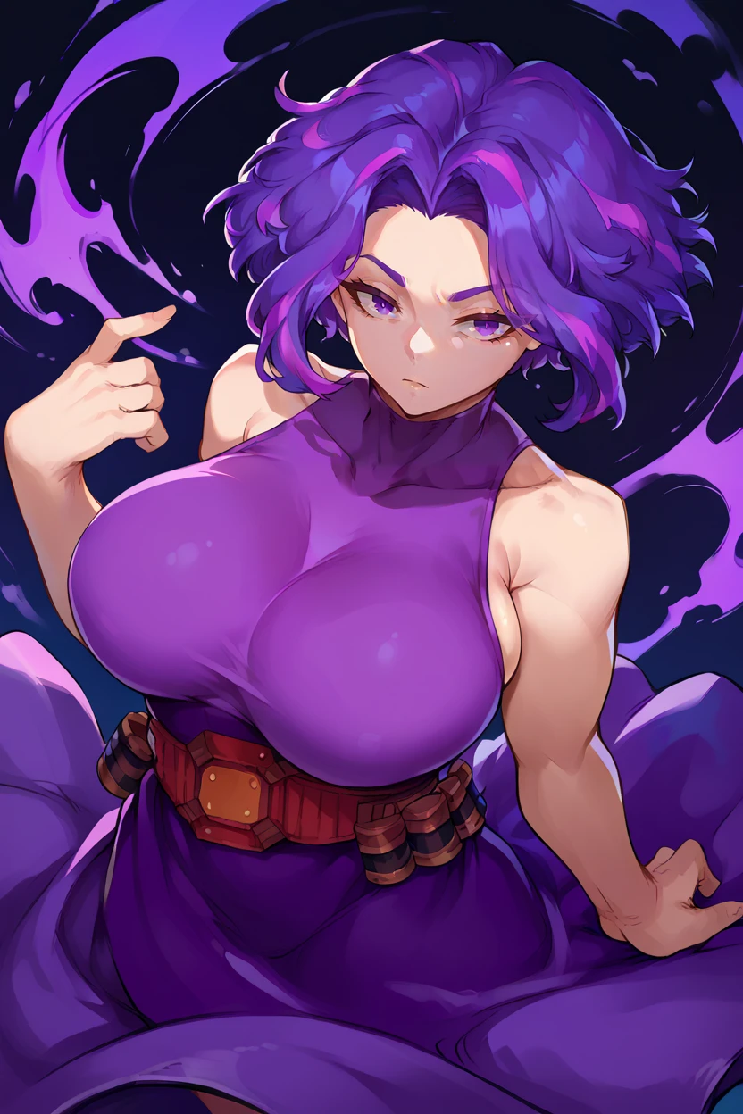 ladynagant, purple hair, streaked hair, short hair, purple eyes, large breasts
