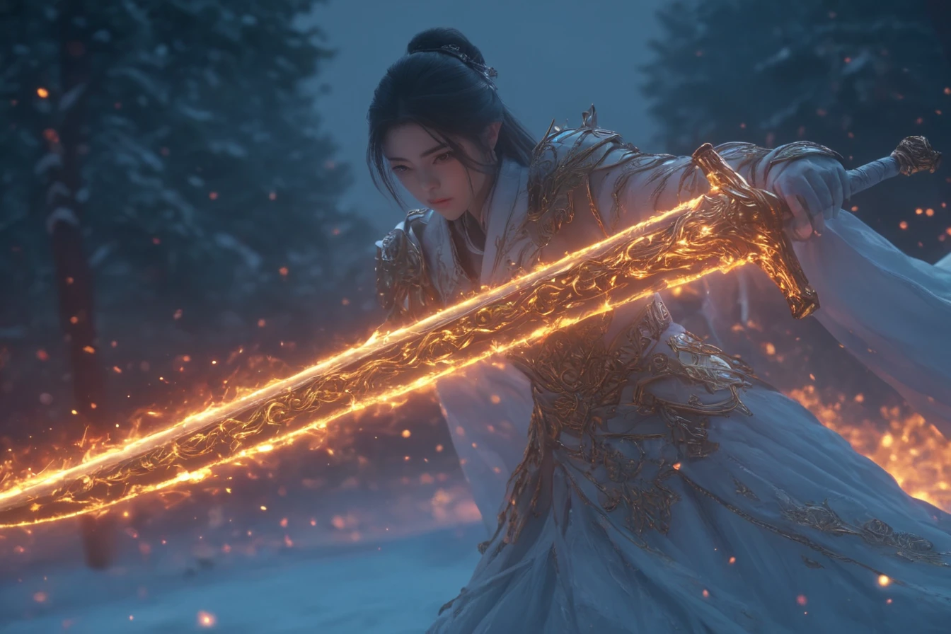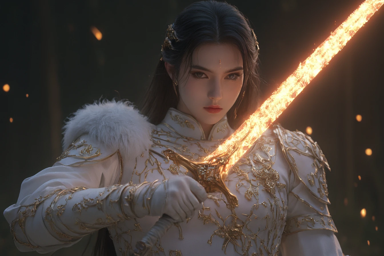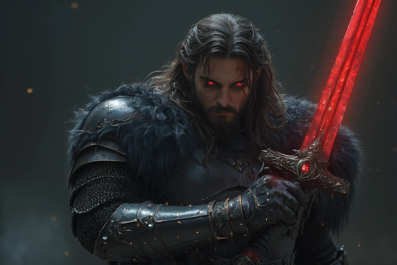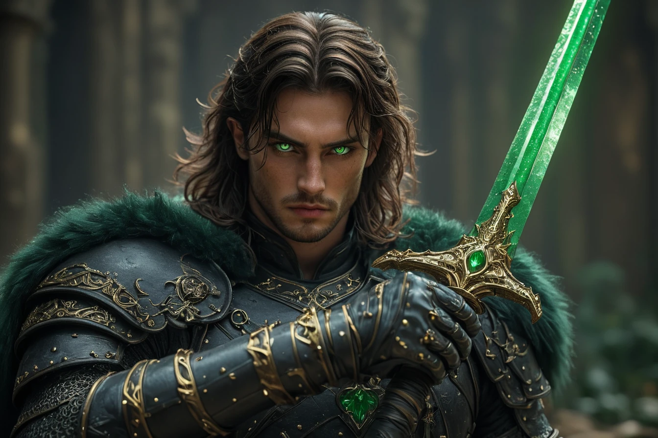 "A handsome young man with dark brown hair and green eyes, wearing black armor decorated with gold and green accents holding an emerald sword, with detailed face features, in cinematic lighting with a cinematic shot from a cinematic angle, in a dark fantasy medieval setting, (hkstyle:1.2), (green flames comming from the blade of his sword:1.1)"