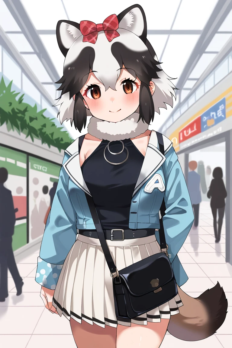 tanuki \(kemono friends\), sp_cos, 1girl, animal ears, dog ears, tail, dog tail, short hair, multicolored hair, black hair, white hair, red hair bow, fur collar, black shirt, blue jacket, long sleeves, pleated skirt, white skirt, shoulder bag