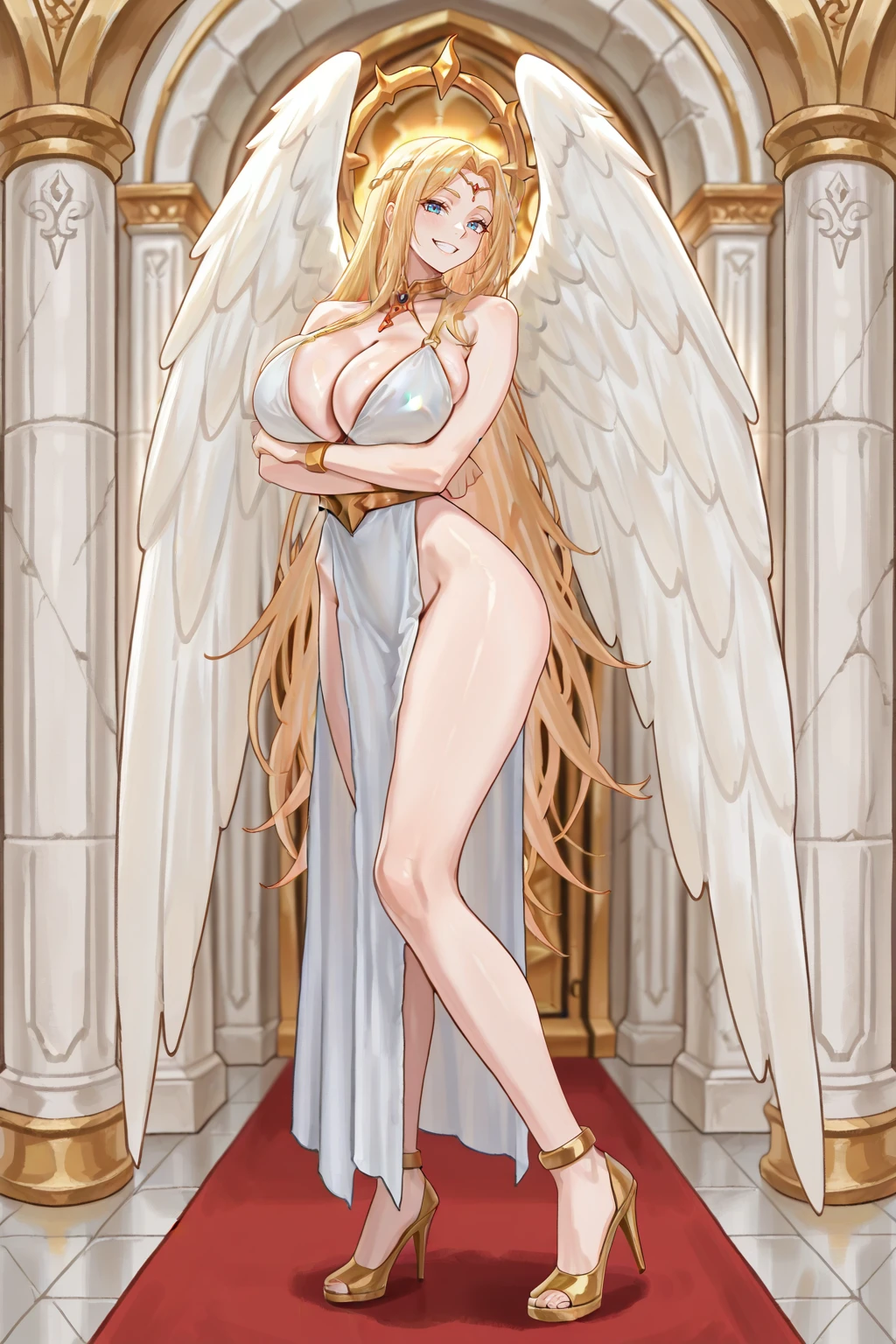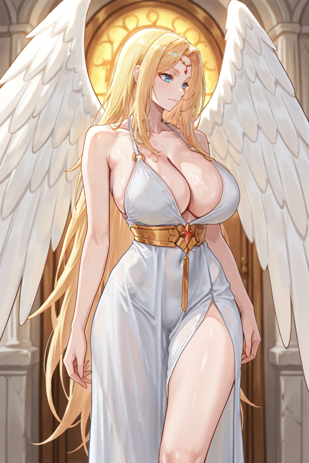 1girl, blonde hair, blue eyes, long hair, angel wings, very long hair,