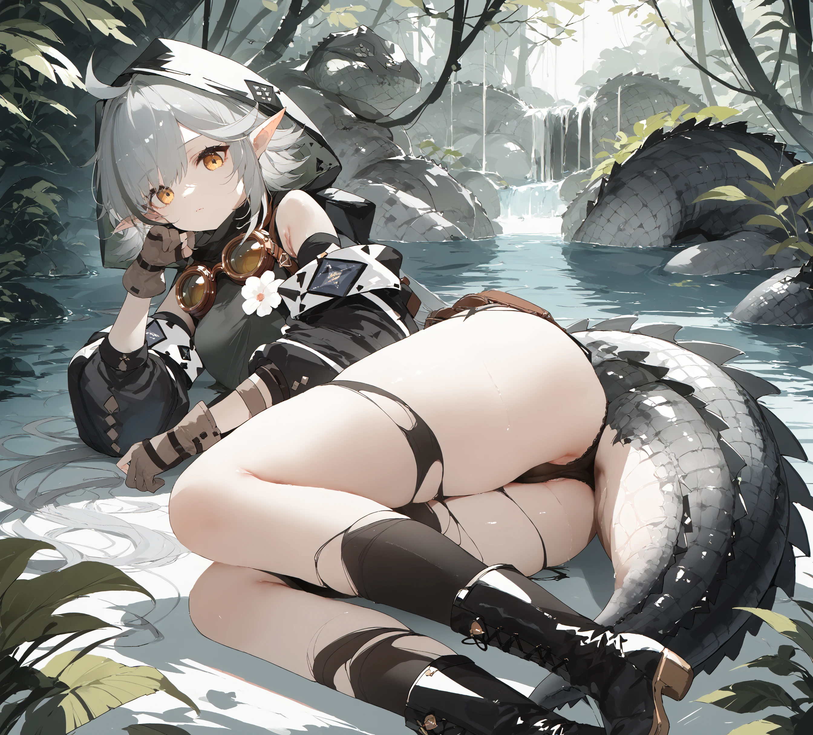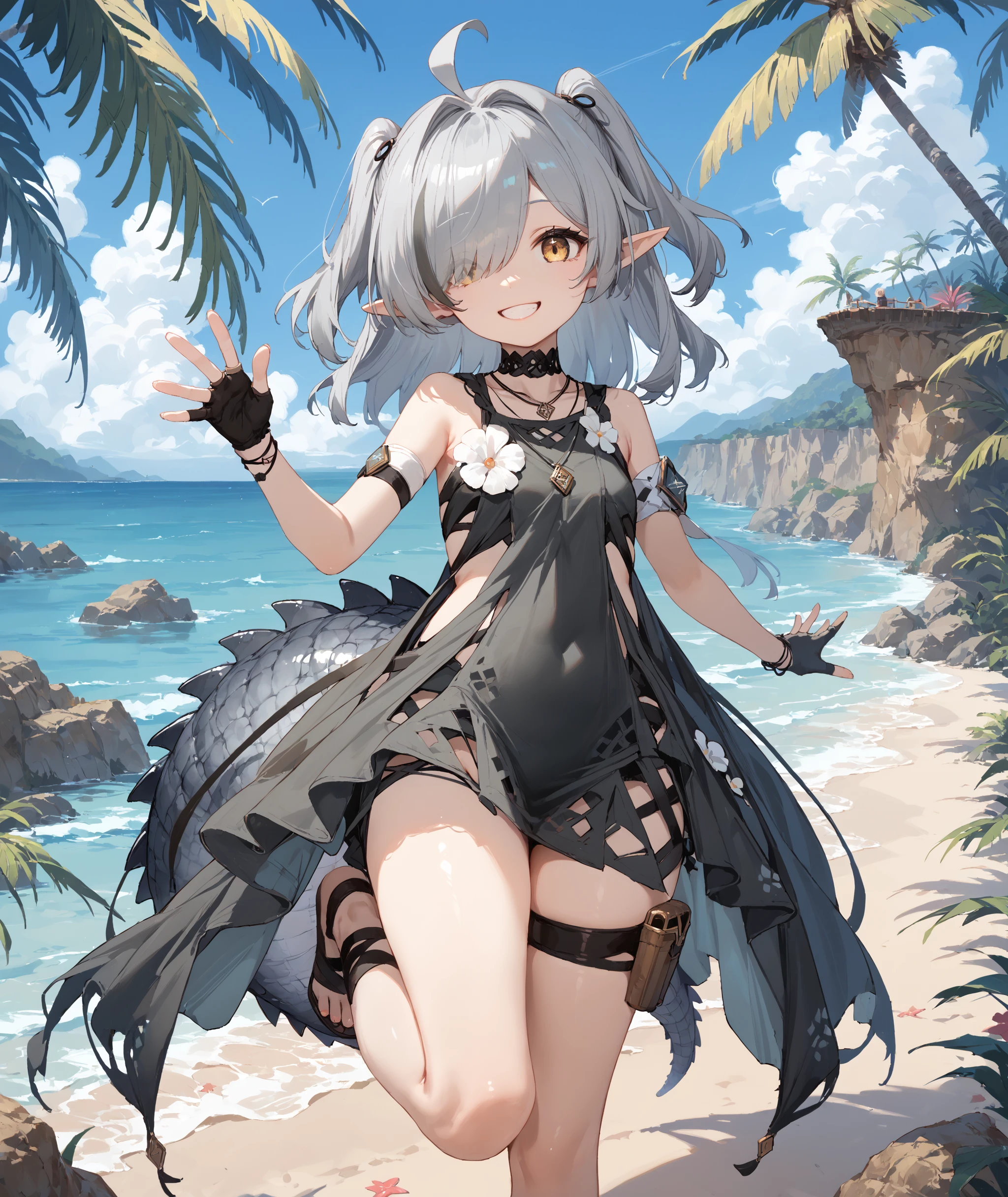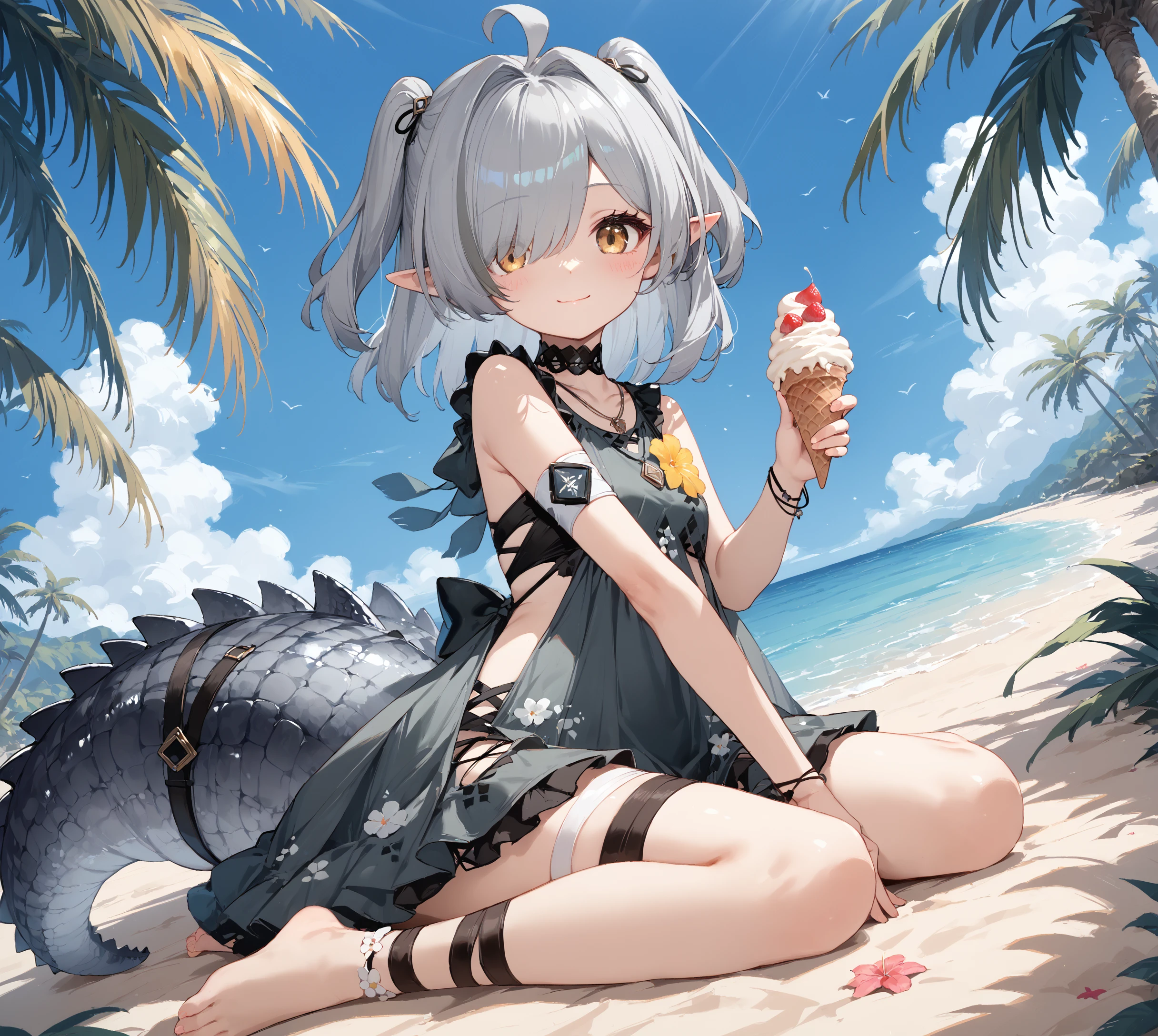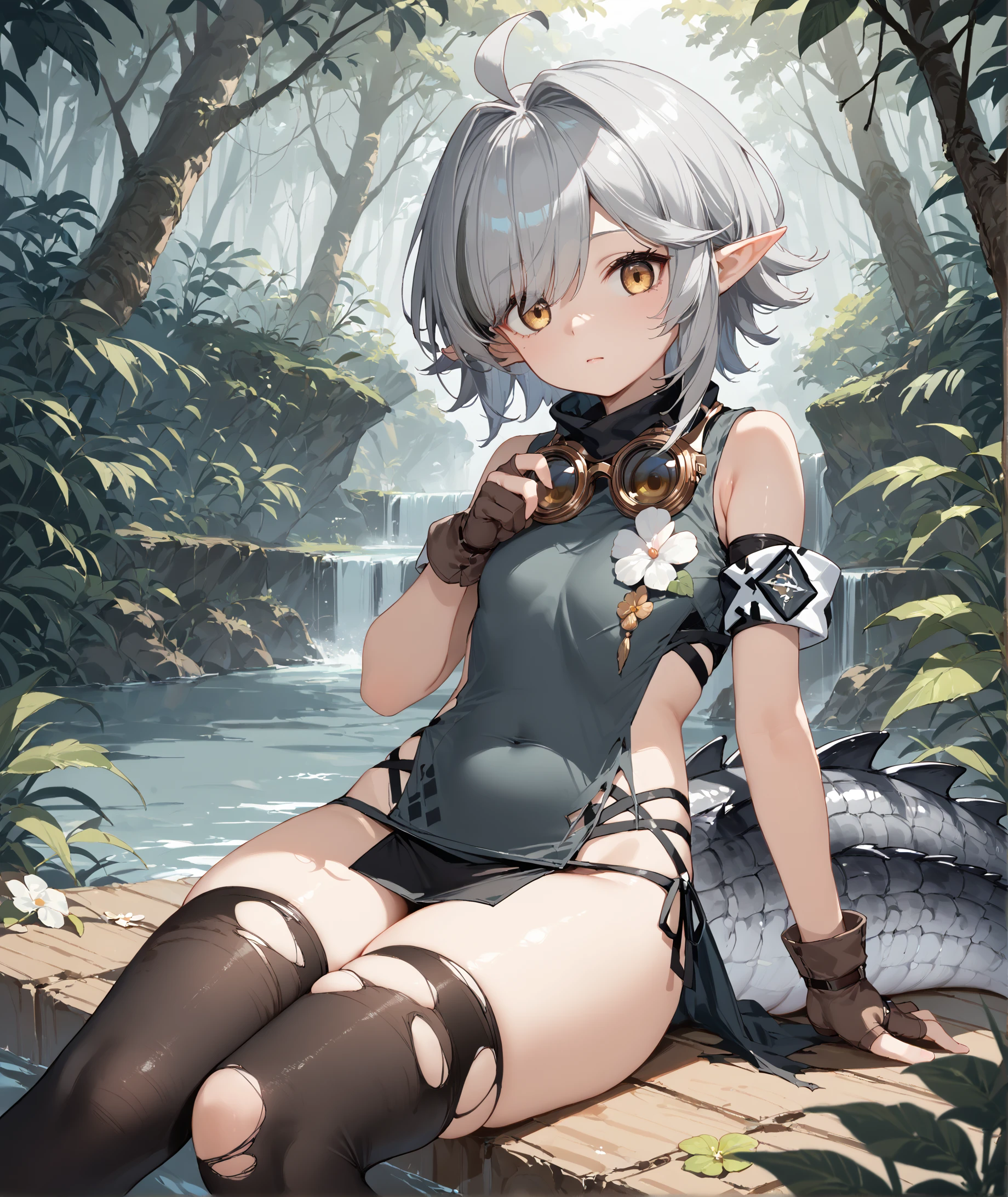 Tomimi, yellow eyes, grey hair, bangs, ahoge, pointy ears, crocodilian tail,