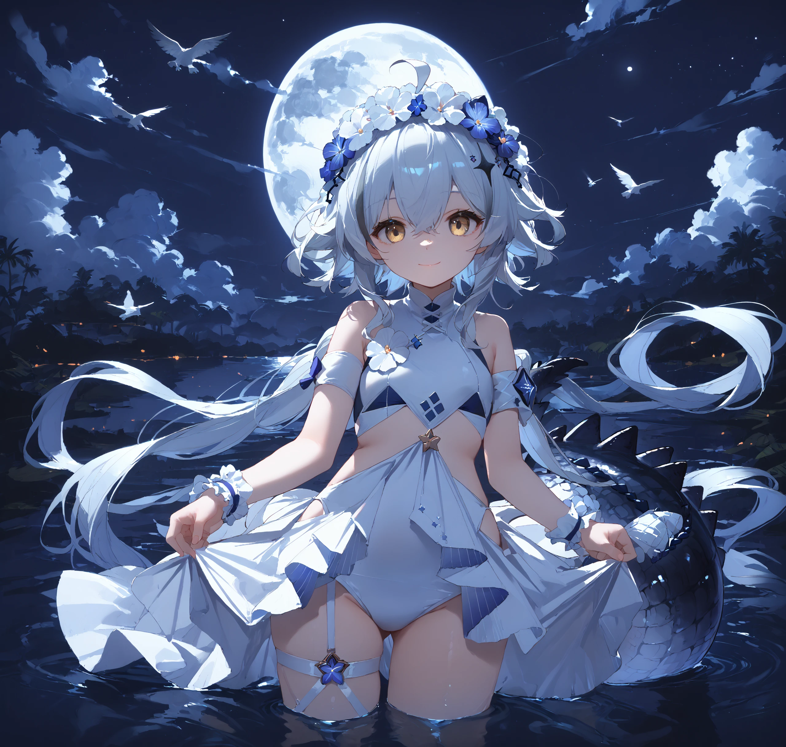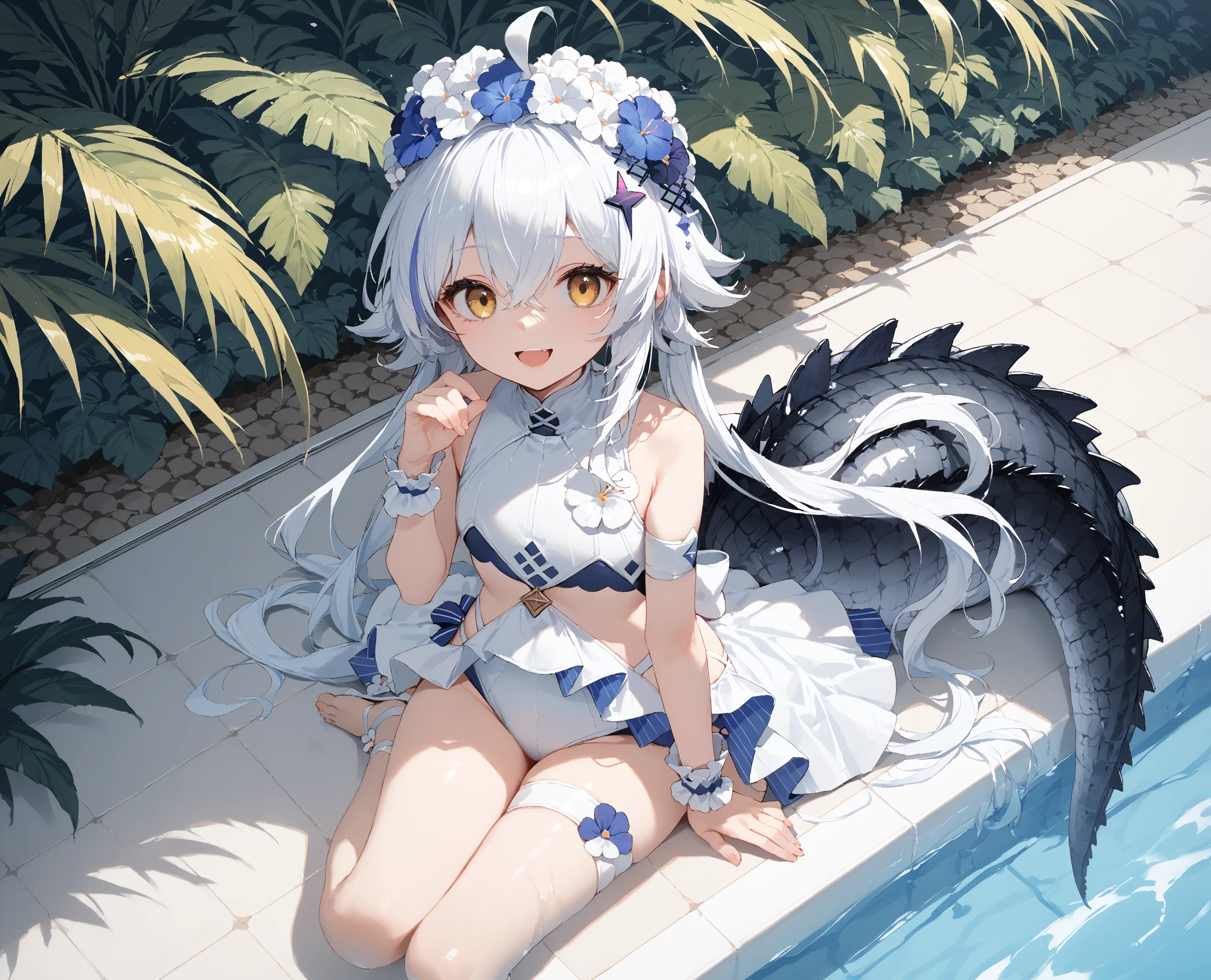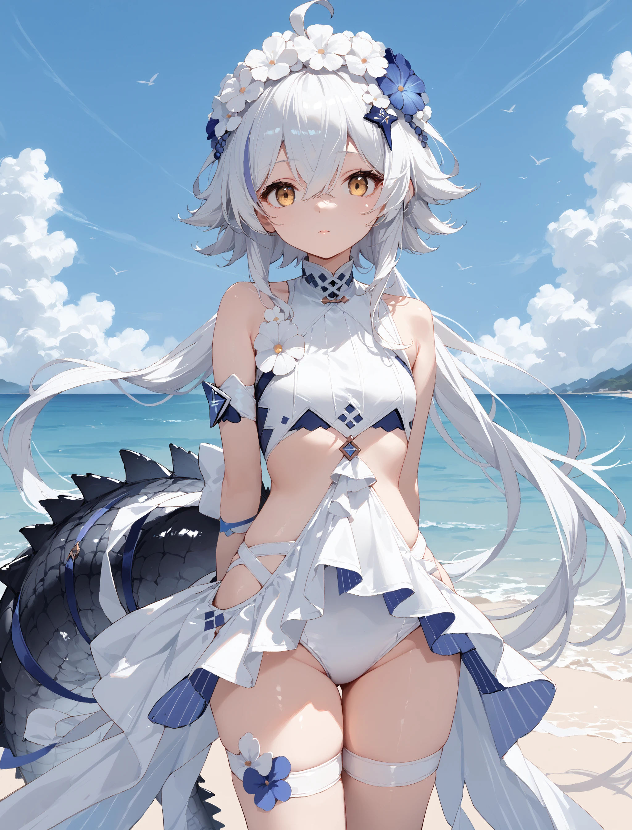 White hair, long hair,white one-piece swimsuit, hair flower, hair ornament, swimsuit straps, wrist cuffs,Description