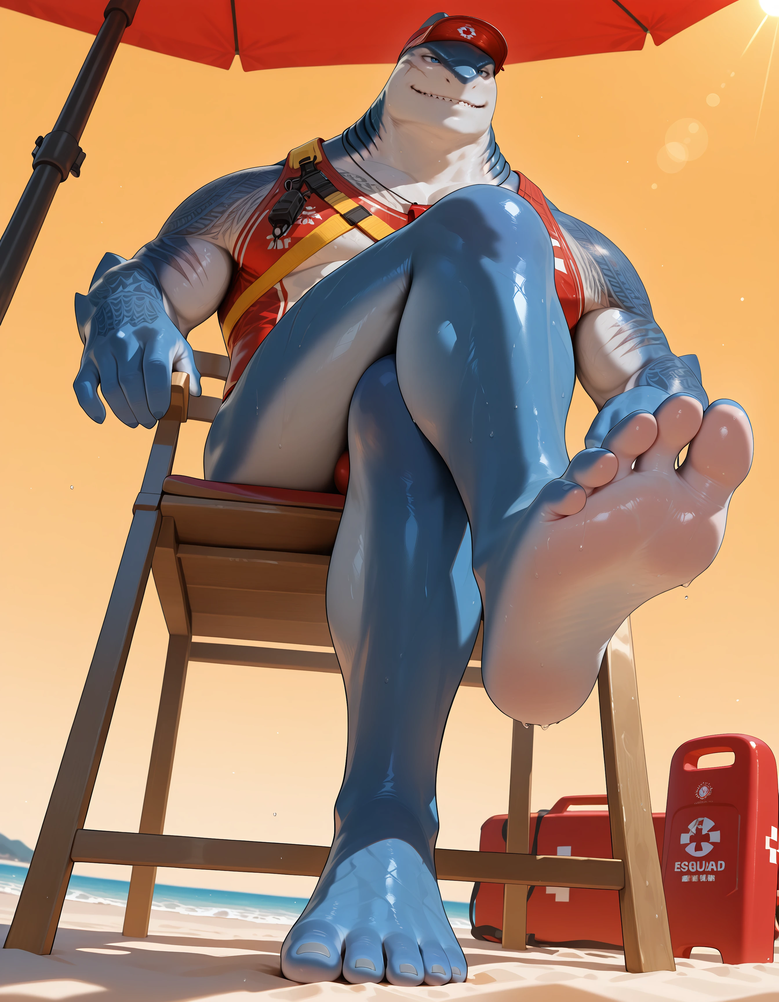 king shark, male, marine, shark, anthro, scar, muscular, muscular male, muscular anthro, tattoo, blue body, fin, gills,