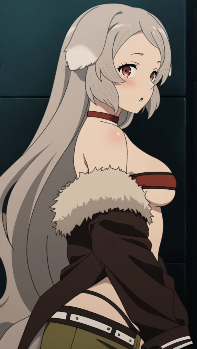 s34s0n 1, red and black bandeau, brown fur-trimmed jacket, green open pants, white belt, black bridal gauntlets, black highleg panties, red choker, brown sandals, 4n1m3 style, medium breasts, cleavage, navel,