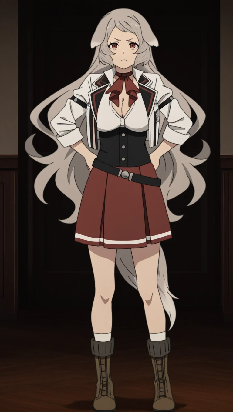 sch001, white and black cropped jacket, open jacket, white collared shirt, black corset, buttons, red and white skirt, black belt, alternate red neck ribbon, white socks, brown ankle boots, 4n1m3 style, large breasts, cleavage,