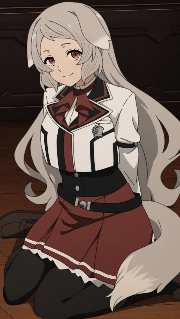 purs3n4, red eyes, grey long hair, grey dog ears, grey dog tail,
