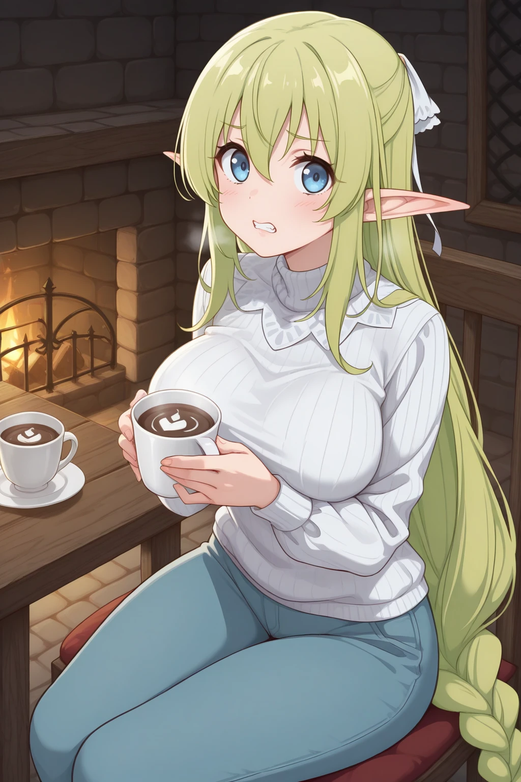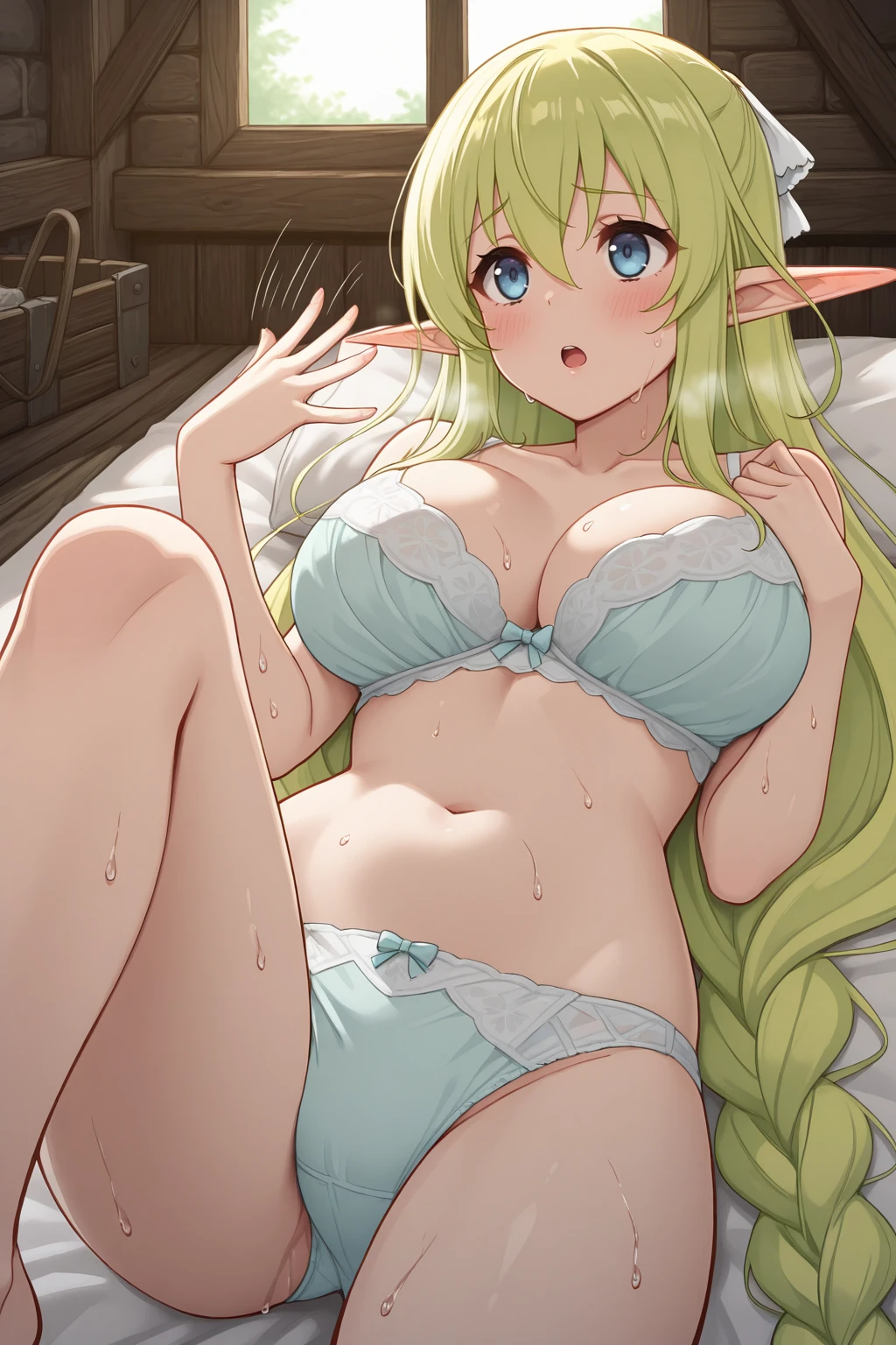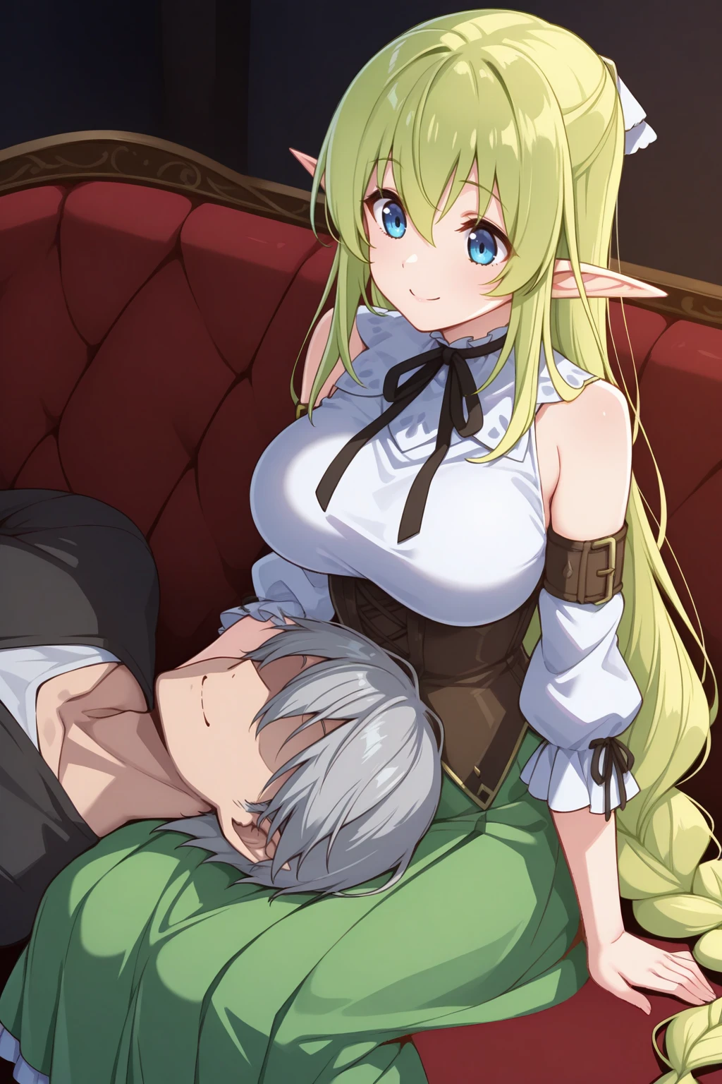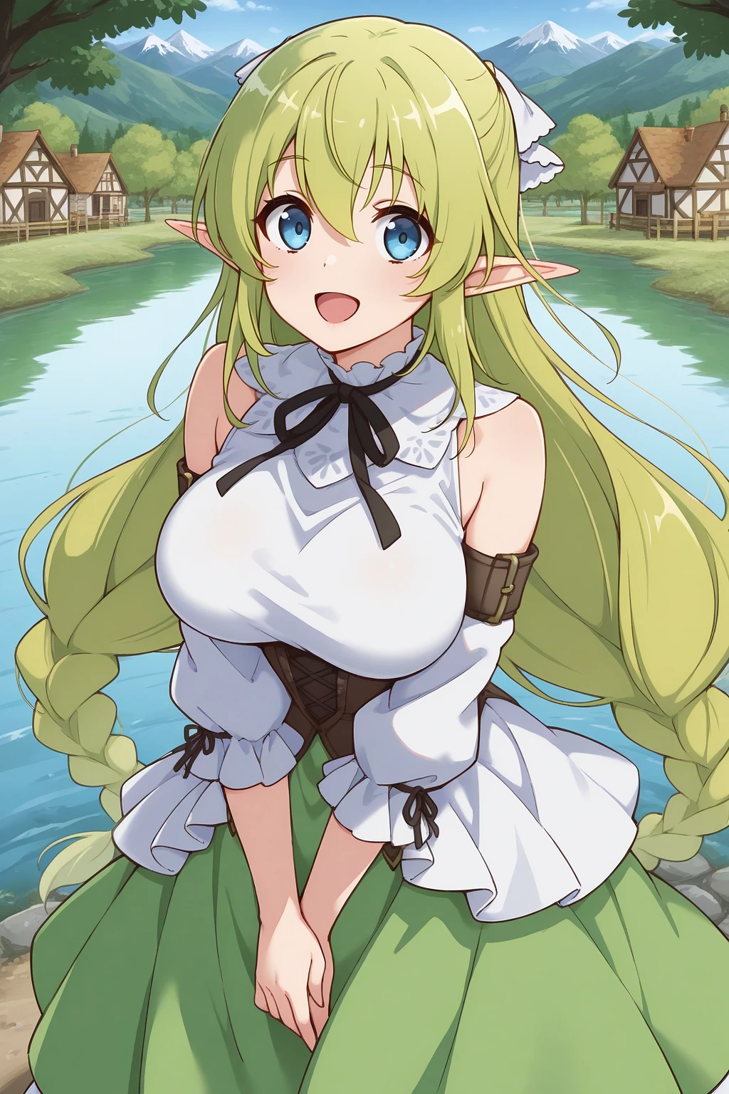 lyrl, large breasts, pointy ears, blue eyes, green hair, hair between eyes, very long hair, low-braided long hair, twin braids, half updo, hair ribbon