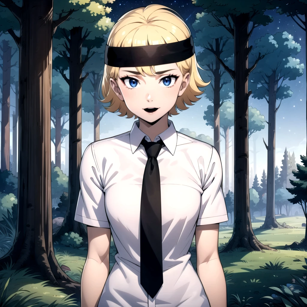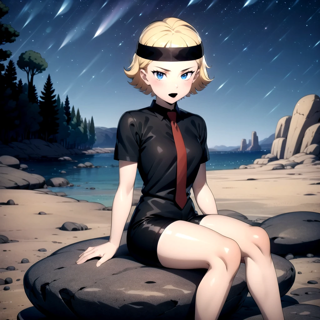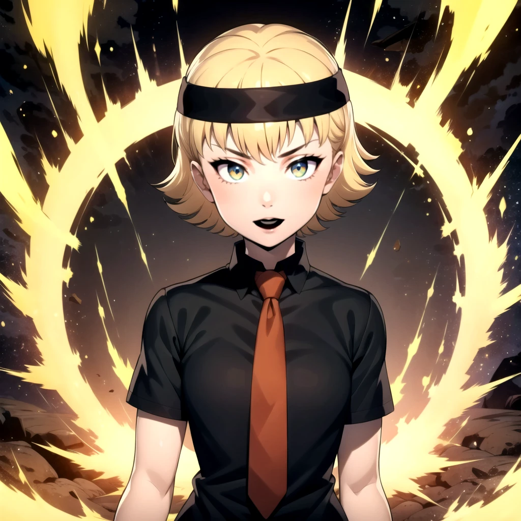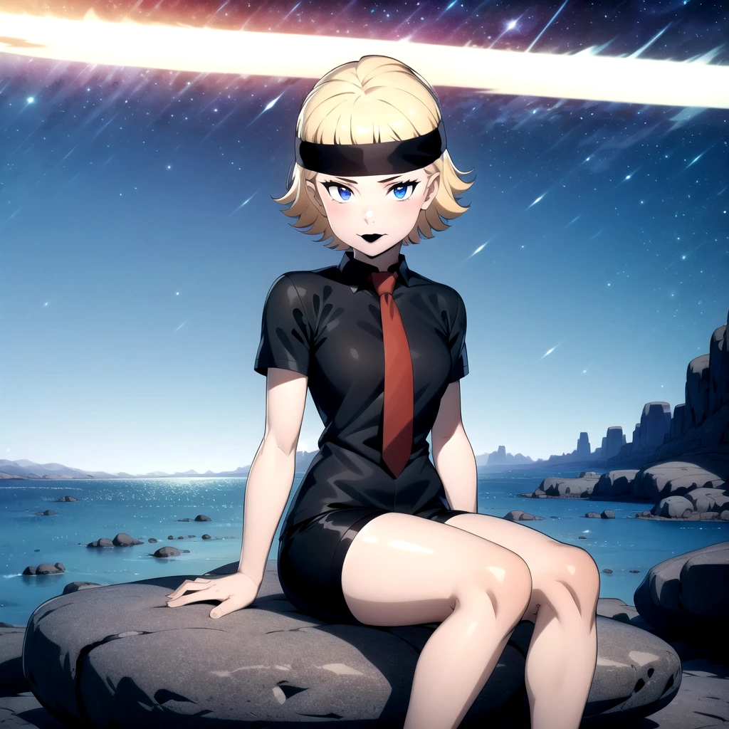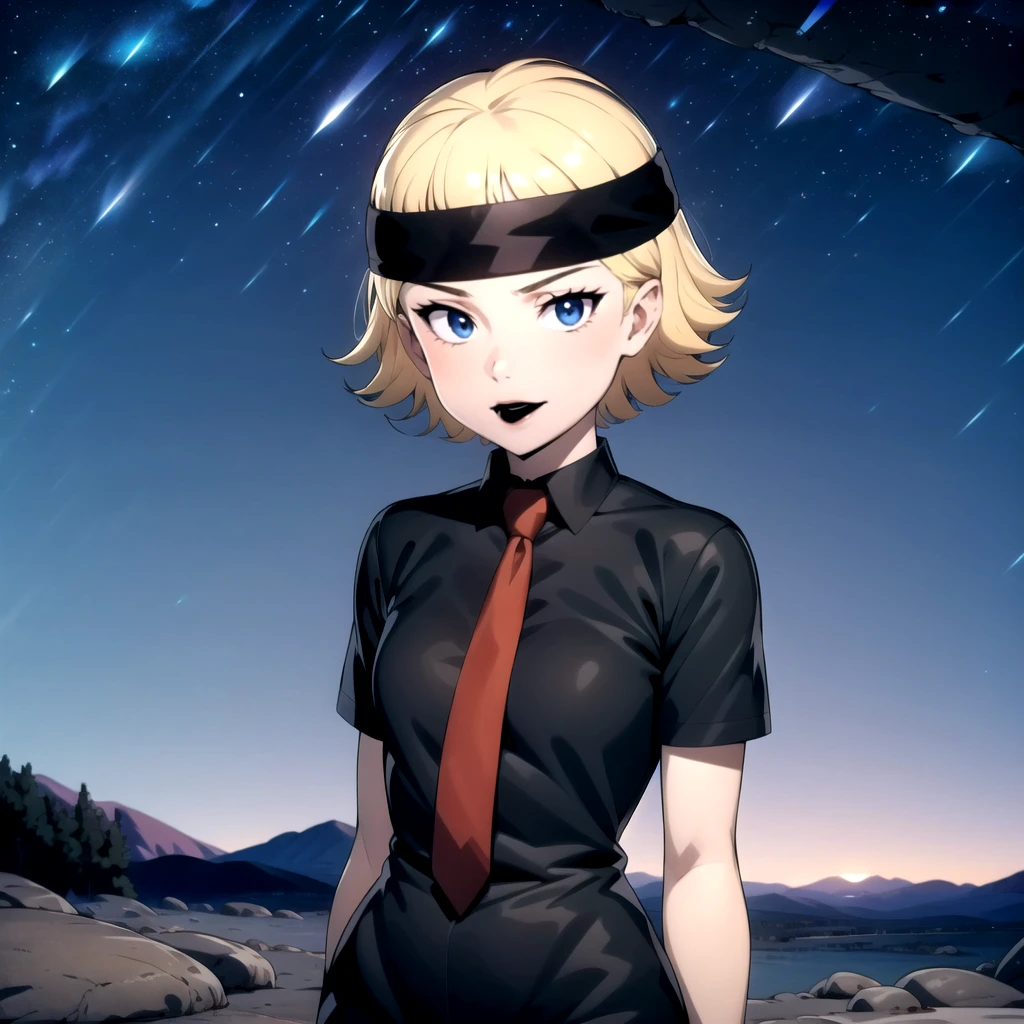 1girl, solo, Alasta Lander, short hair, blonde hair, blue eyes, black lipstick, black lips, black headband,