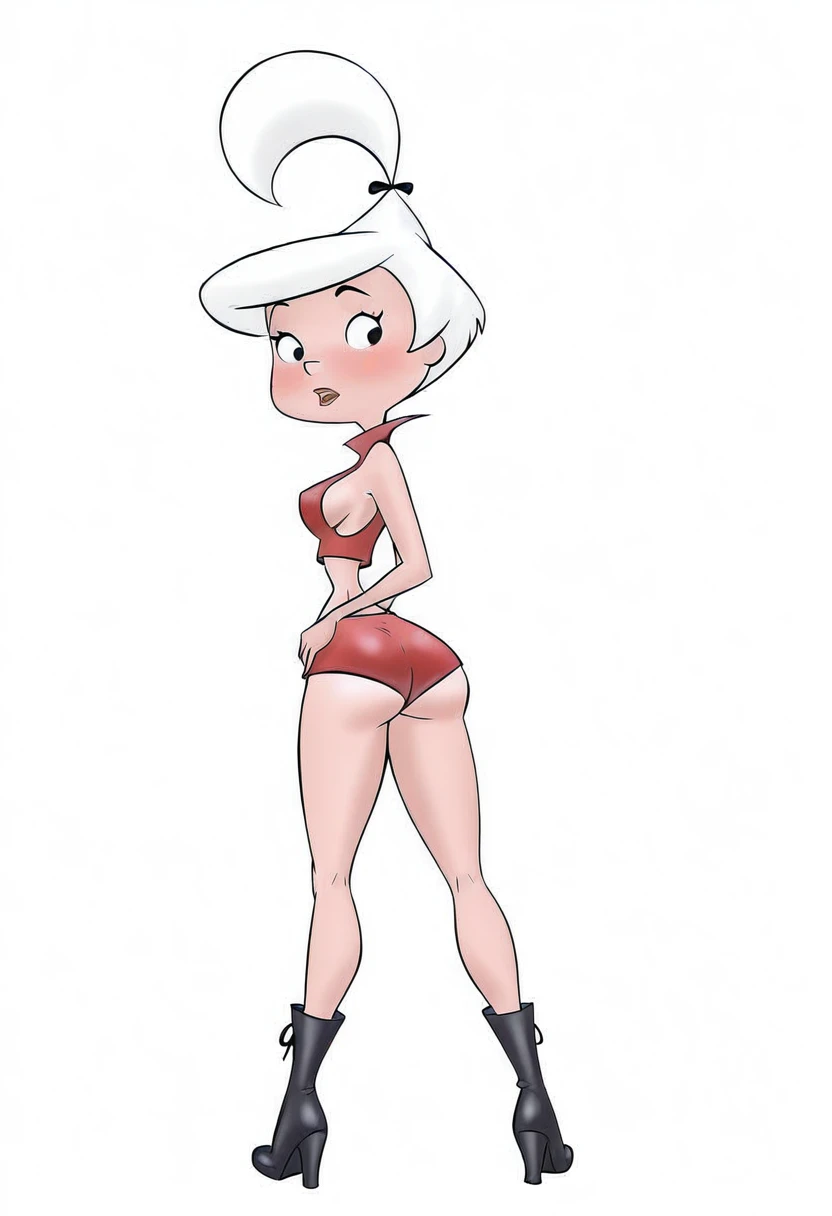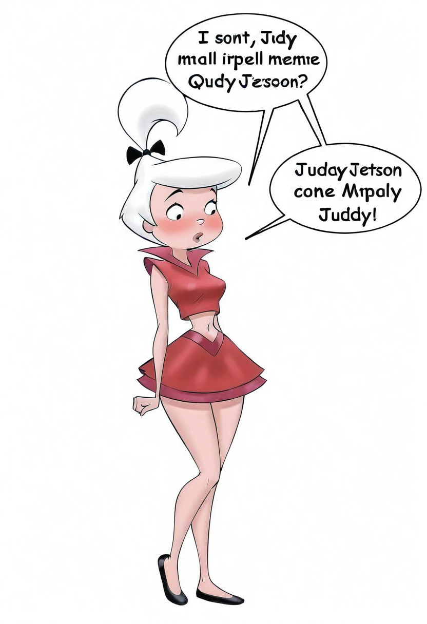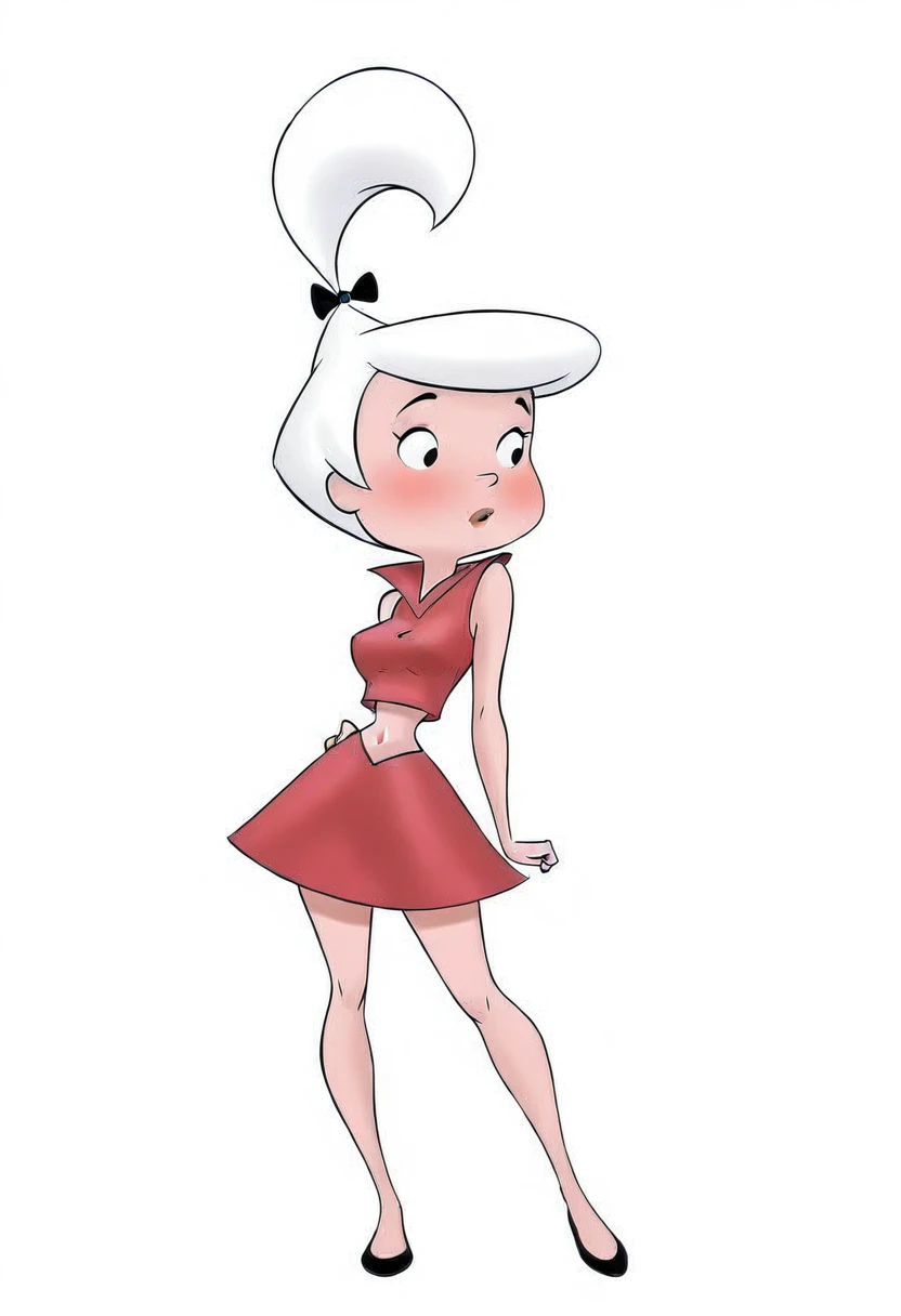 judy_jetson, 1girl, blush, short hair, white hair, medium breasts, small breasts,red skirt, black footwear, midriff, navel, crop top, red shirt, black hair bow, high ponytail,For generating George Jetson: