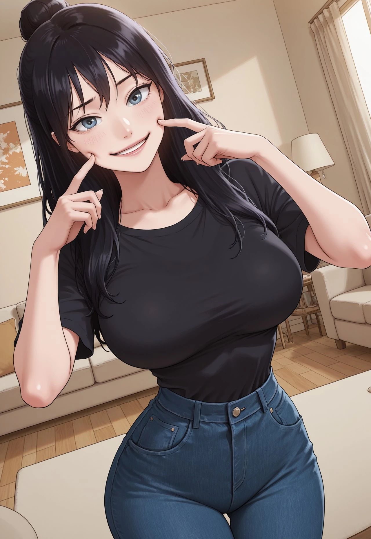 Ahyoon, Black Hair, Blue Eyes, Long Hair, Loose High bun, Large Breasts,