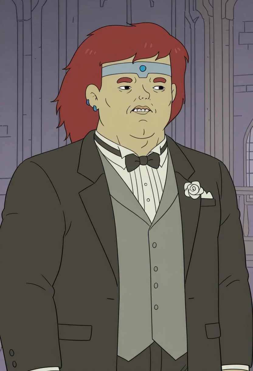 DS_Cha0ticG00dB4rb4ri4n,1boy,circlet,red hair,black eyes,male focus,jewelry,earrings,muscular,teeth,