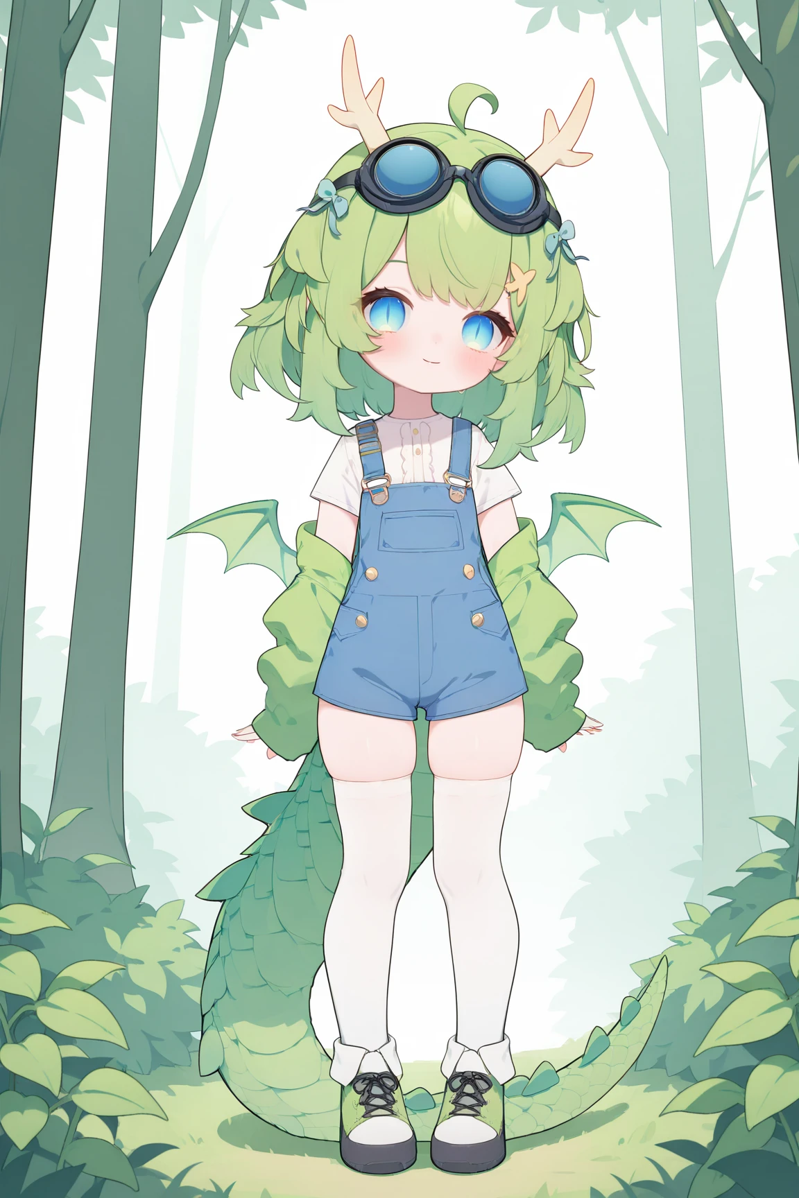 DragonGirlMPVTILXLv2, blue eyes, green eyes, multicolored eyes, slit pupils, green hair, short hair, bangs, ahoge, horns, hair ornament, blue bow, black goggles, goggles on head, green wings, dragon tail, flat chest, green jacket, white shirt, short sleeves, blue overall short, white thighhighs, green shoes