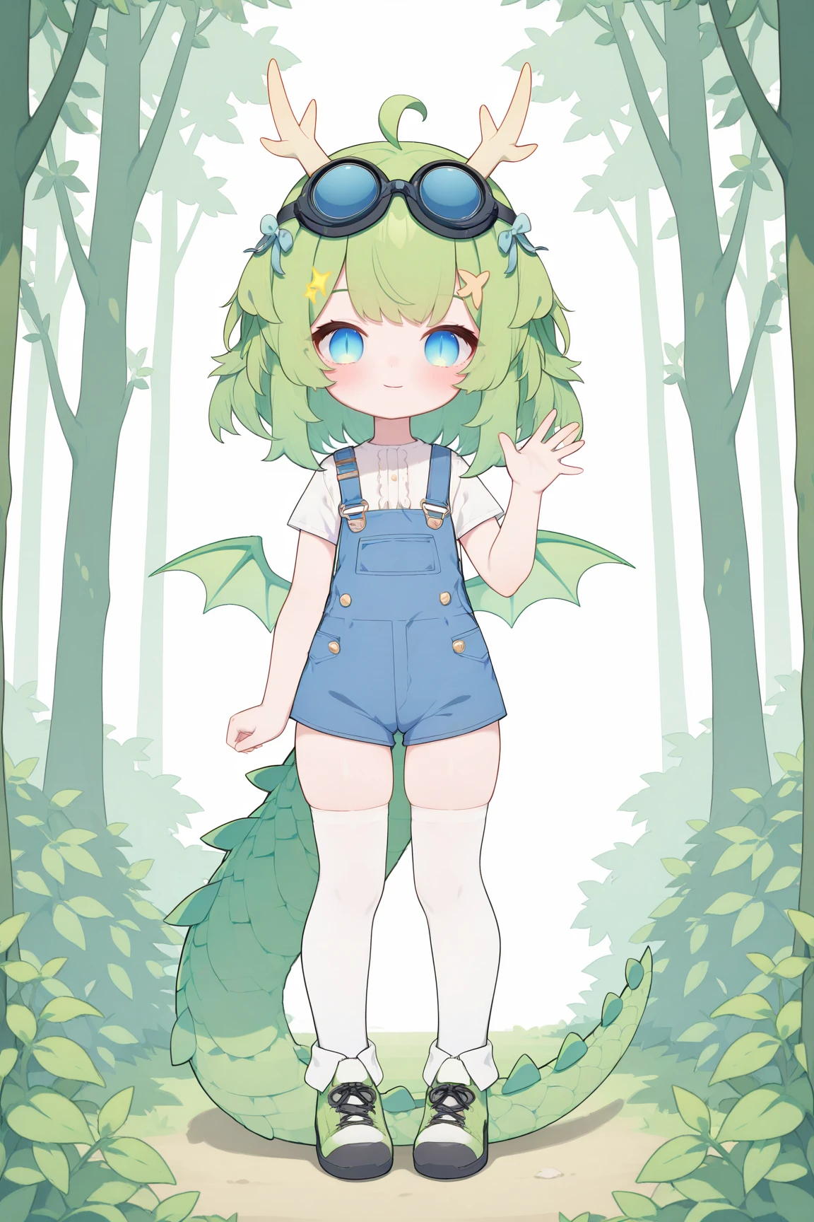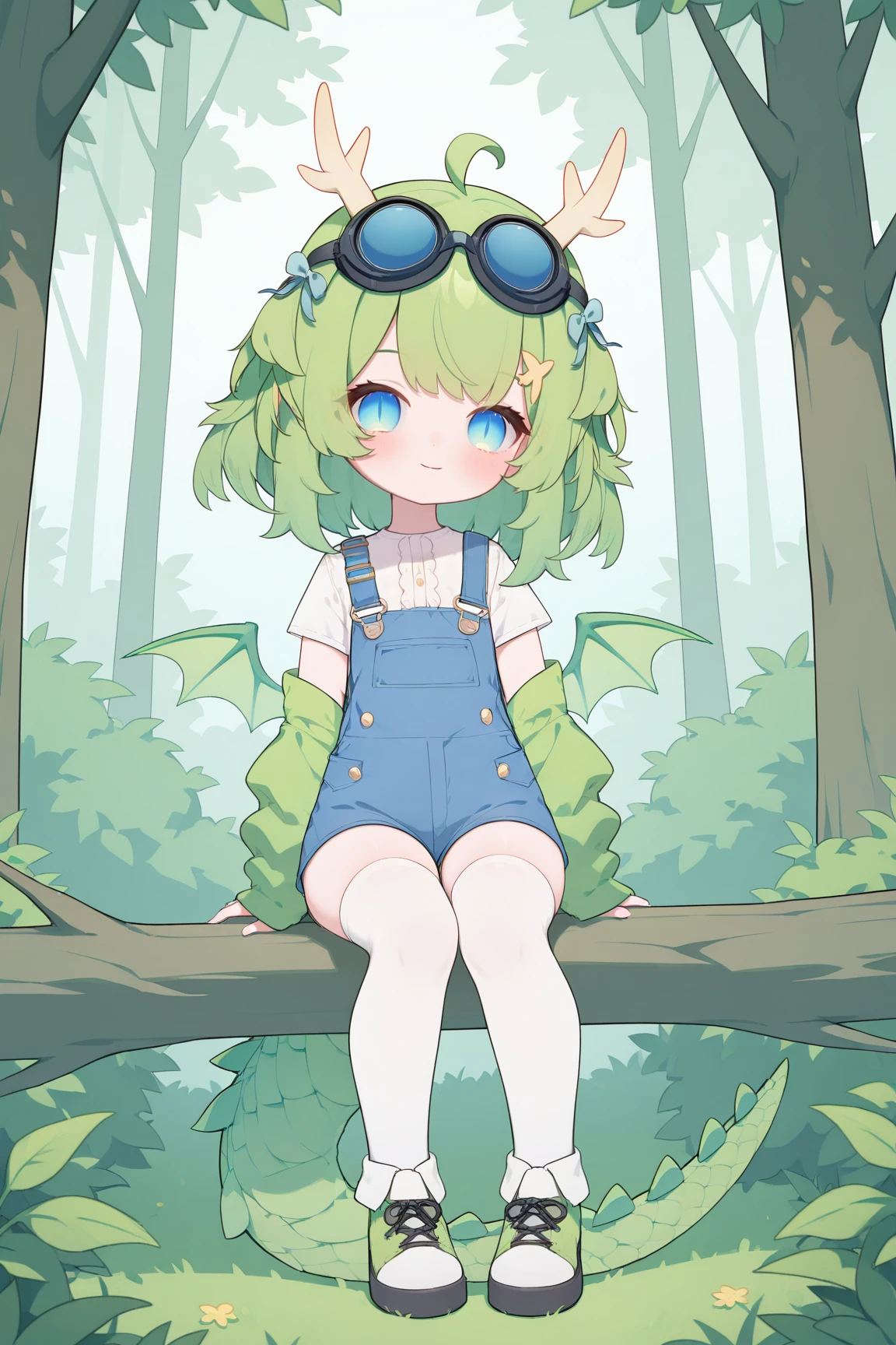 ➜ DragonGirlMPVTILXL, blue eyes, slit pupils, green hair, short hair, bangs, ahoge, horns, hair ornament, blue bow, black goggles, goggles on head, green wings, dragon tail, flat chest, green jacket, white shirt, short sleeves, blue overall short, white thighhighs, green shoes]--|======[ 💗 My Settings: 💗 ]======|--[