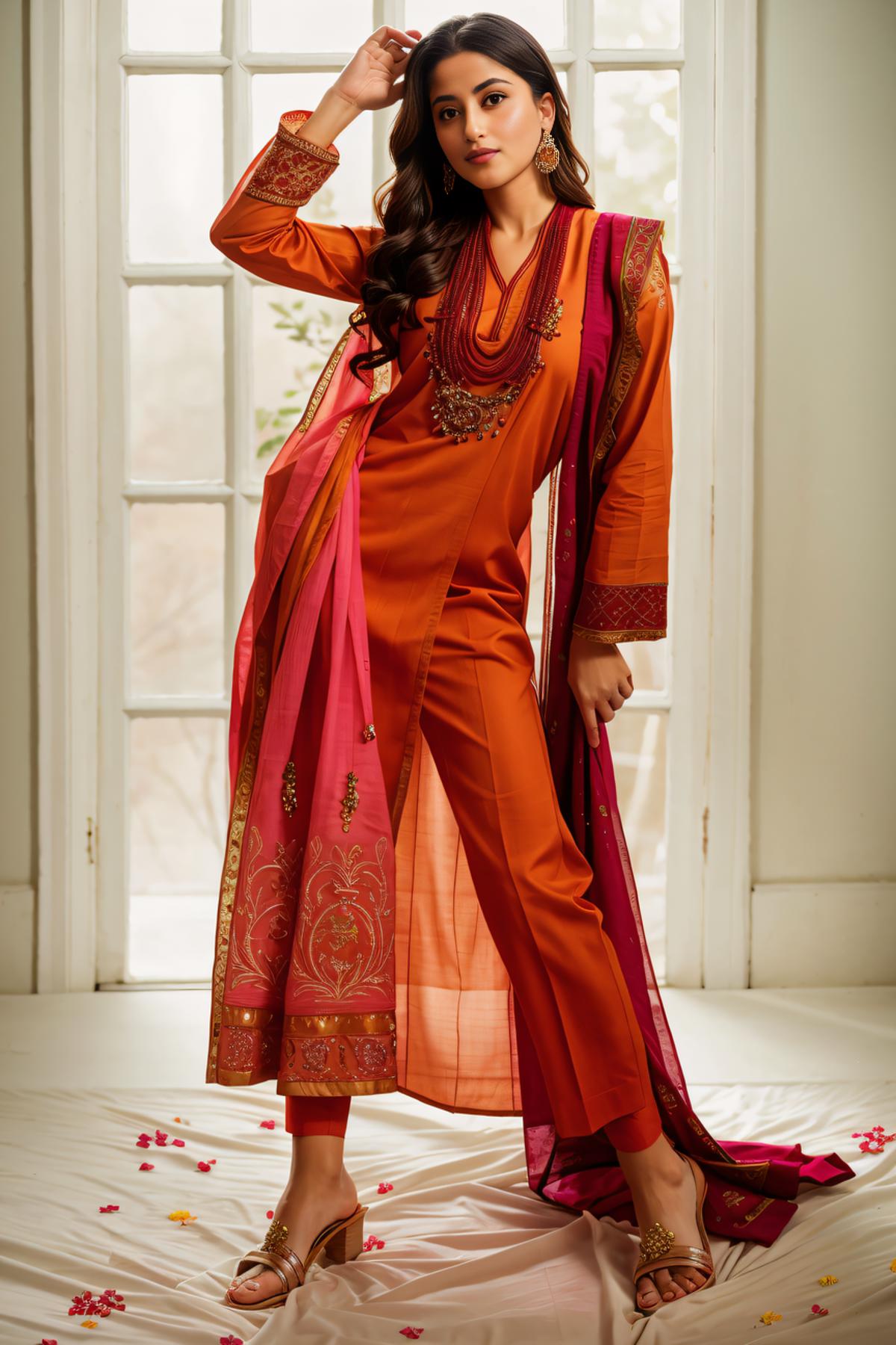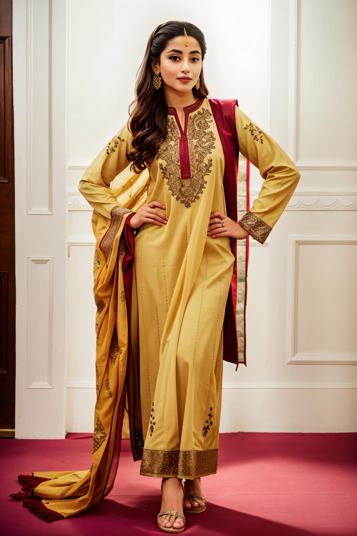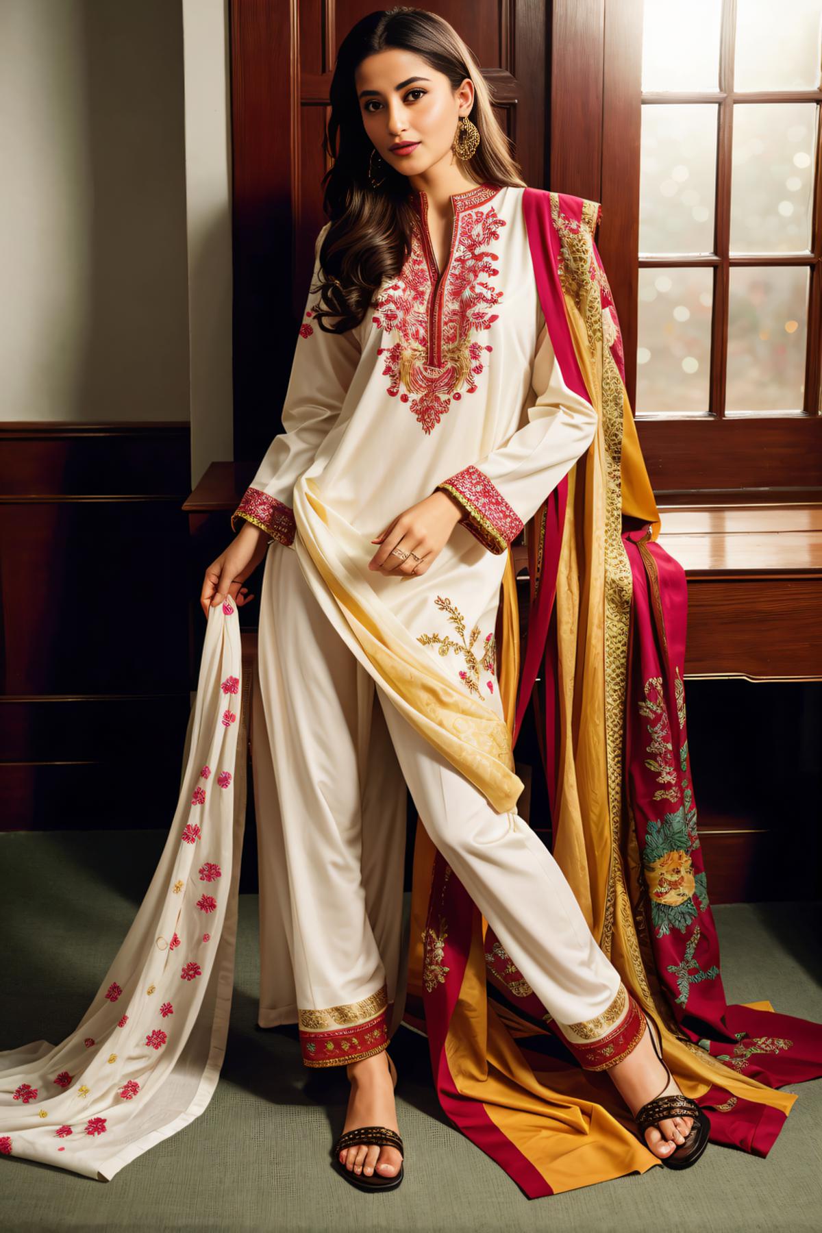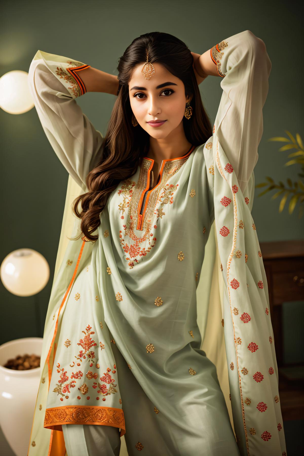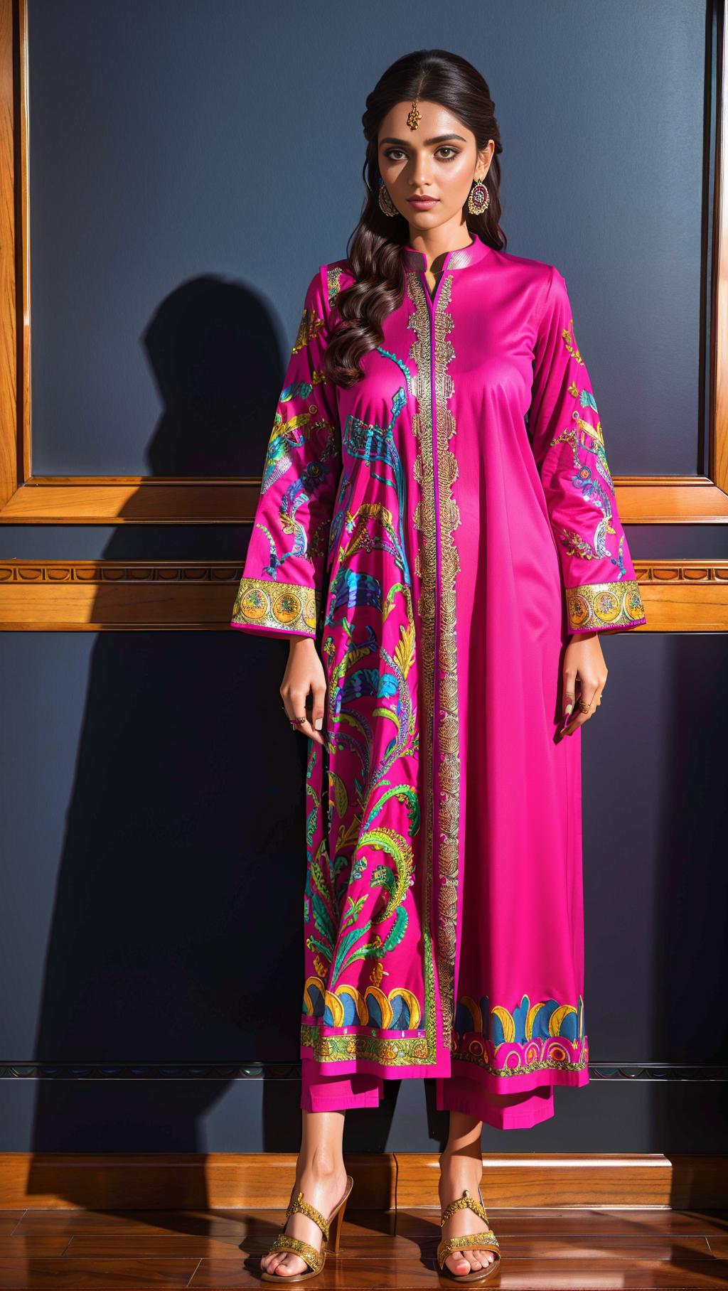 Positive prompt: xyzsanshalwarqameez, (highly detailed:1.3), 1girl, solo, (full body:1.3), zig-zag pattern, nice hands, perfect hands, embroidery , 1girl, embroidery, pink dress, shalwar, Ultra-detail, (highres:1.1), best quality, (masterpiece:1.3), cinematic lighting, (highly detailed face and eyes:1.3),