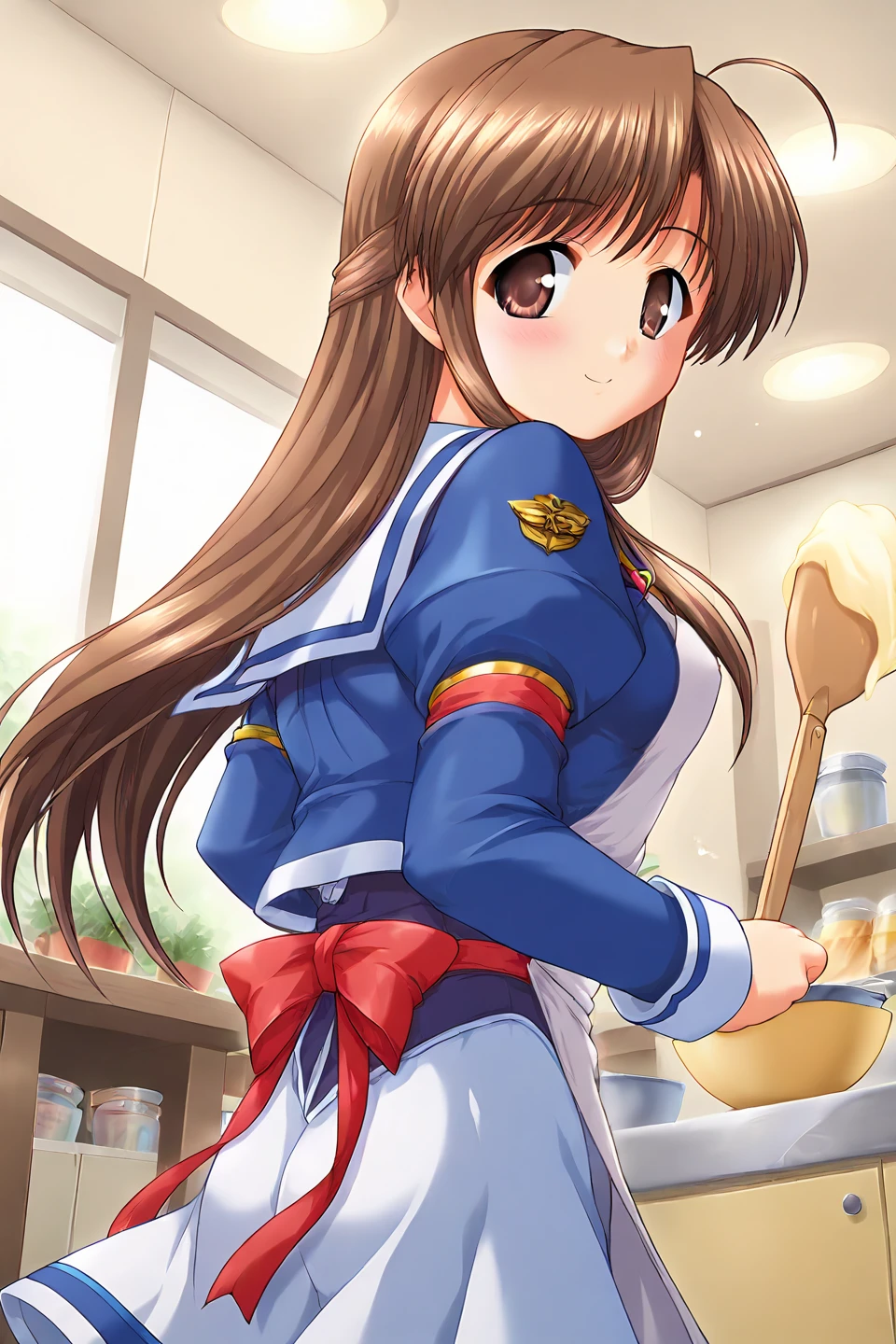 school uniform, white sailor collar, blue jacket, crop top jacket, juliet sleeves, emblem, red ribbon, arm ribbon, white shirt, purple vest, waist ribbon, miniskirt, blue line skirt, cooking, white apron, yellow strap, checker pattern, yellow bow, back bow,