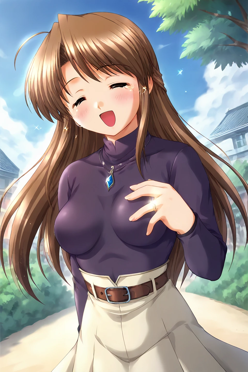 necklace,turtleneck,purple shirt,long sleeves,impossible shirt,taut clothes,brown belt,belt buckle,ocher corset,ocher skirt,high-waist skirt,long skirt,pleated skirt,