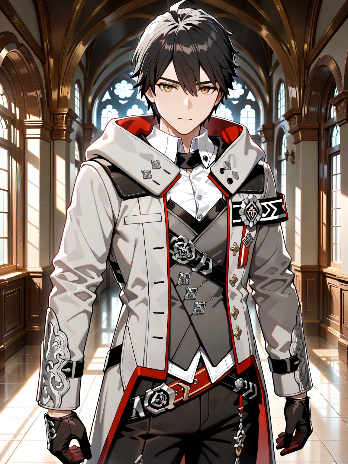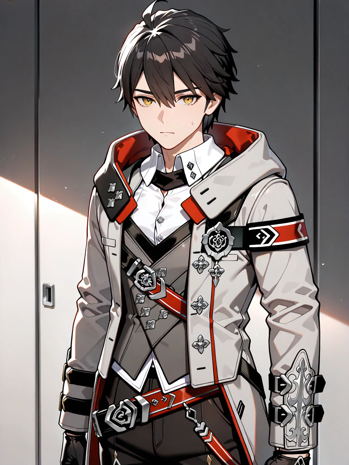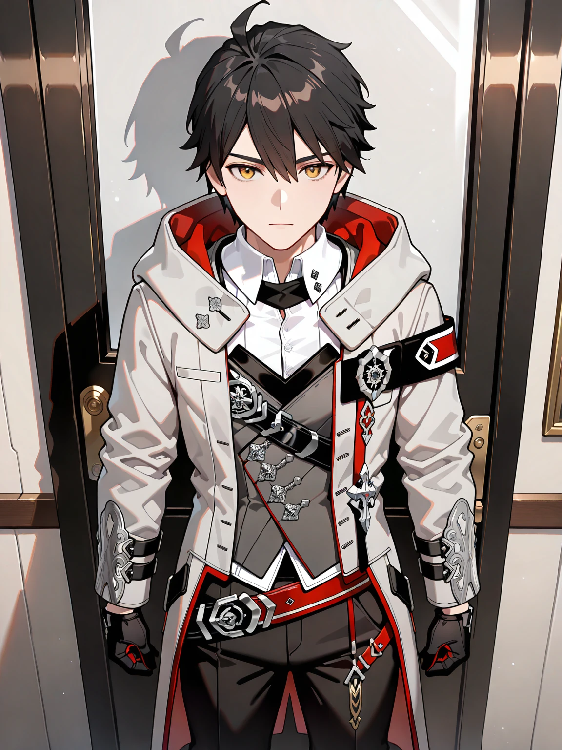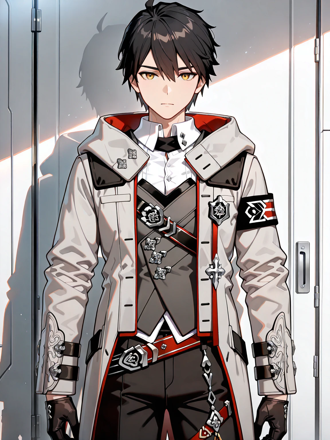 1boy,adam (APHO),black hair,yellow eyes,white shirt,vest,grey coat,belt,black gloves,black pants,black boots,